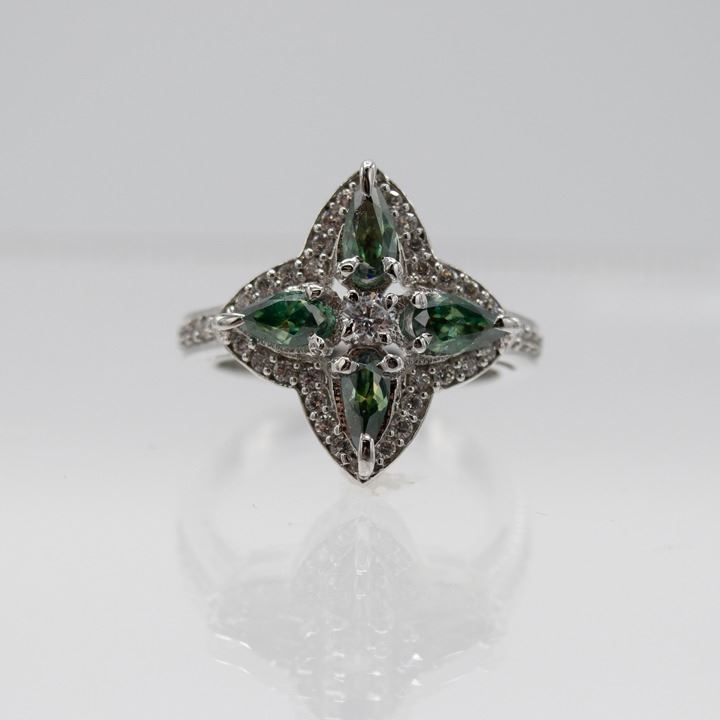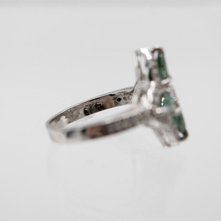 Amazing 3.35 Ct Diamond Ring. This lab created diamond ring has 4 eye VVS1 mint green pear cuts with cz accent stones. These 4 pear cut lab diamonds will test positive for a diamond on almost any diamond tester. Mounted in solid .925 sterling silver complimented by rhodium which is a precious metal that is in the family of platinum. Rhodium overlay. It is also tarnish resistant. Size 7 1/2. Total weight is approx. 4.4 grams