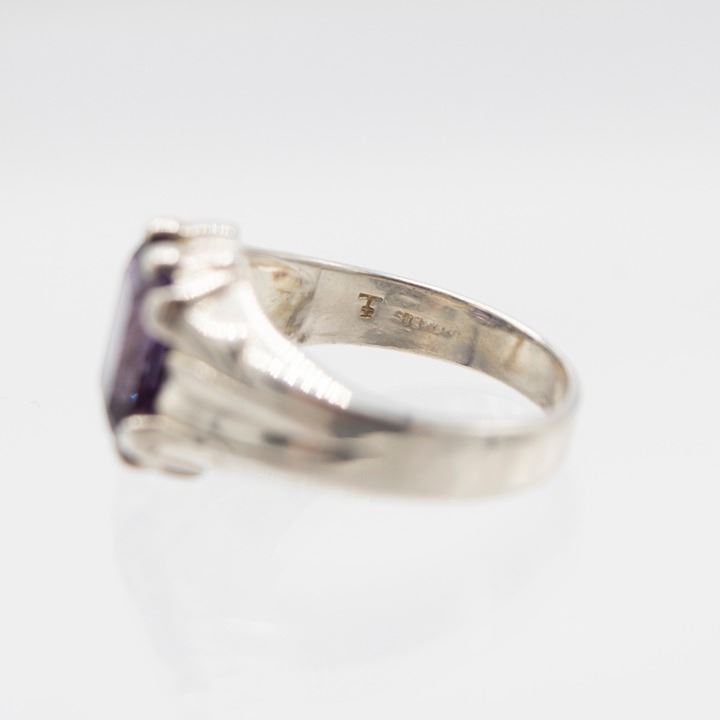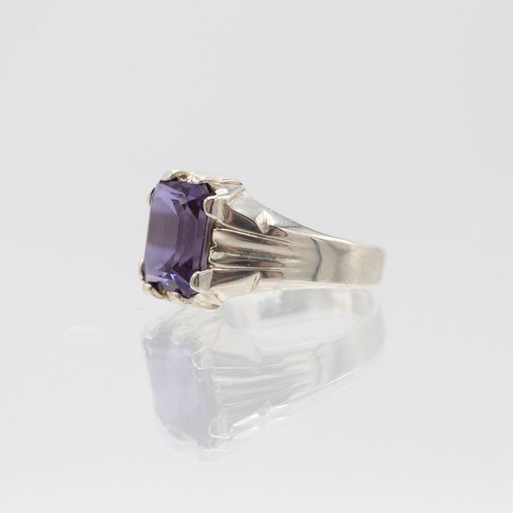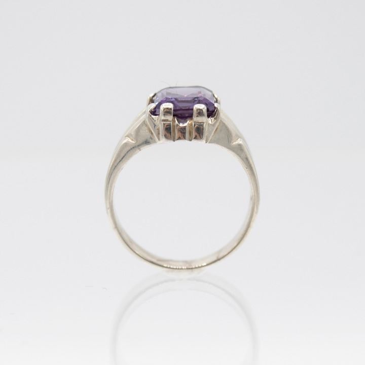 Breathtaking 5 Ct Russian Alexandrite Ring. This lab grown alexandrite is near flawless and has the same chemical make up as a mined from the earth natural alexandrite would have. The chemical compounds are BeAl2O4 Beryllium aluminum oxide, commonly with small amounts of iron and chromium. The mohs hardness Is an 8.5. This true color change alexandrite Is an emerald cut 8 x 6 mm. Mounted In Solid .925 sterling silver. Size 8.The total gram wt. Is Approx. 5.2 grams