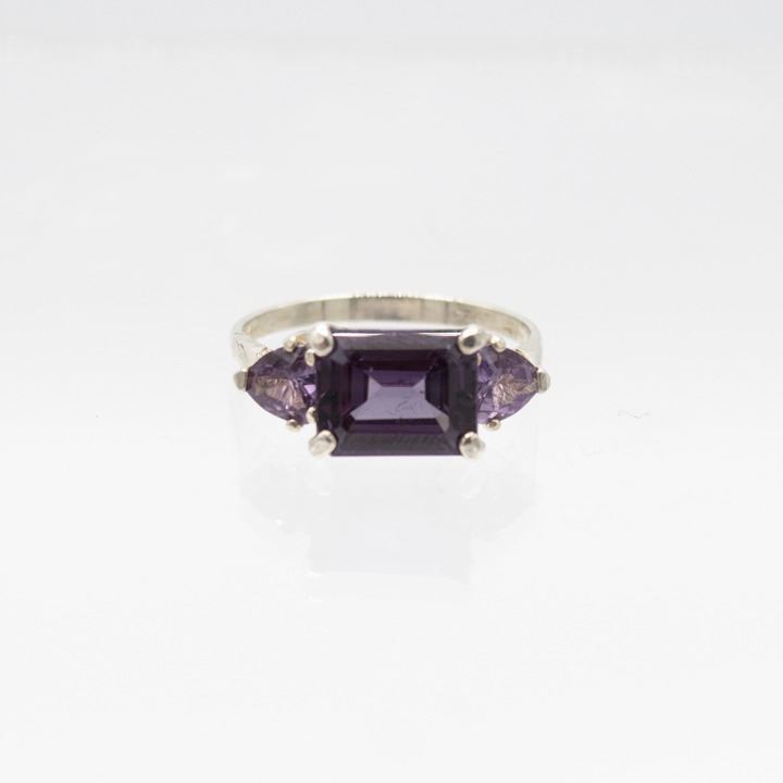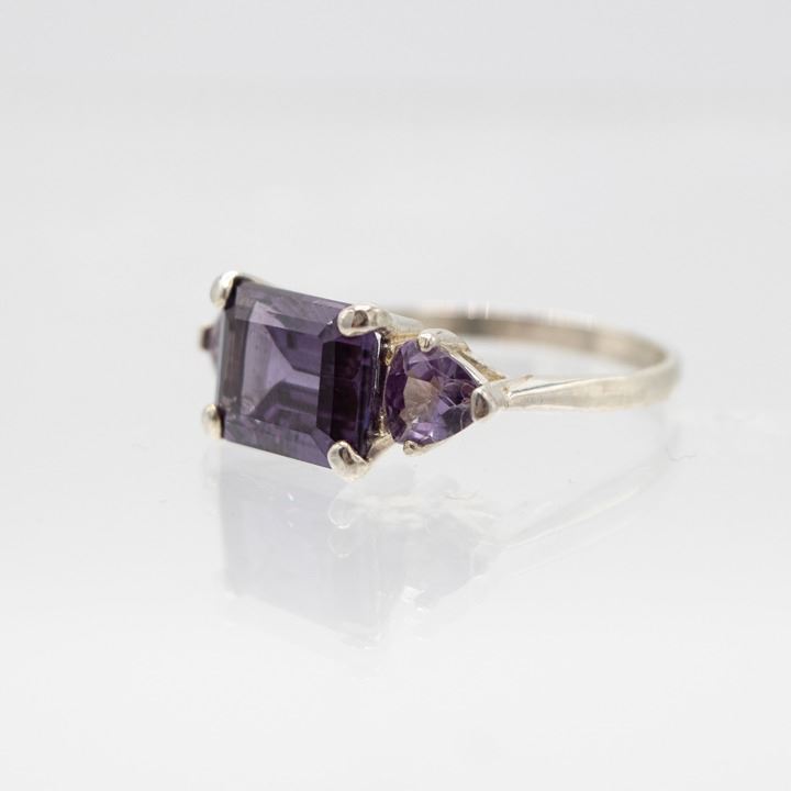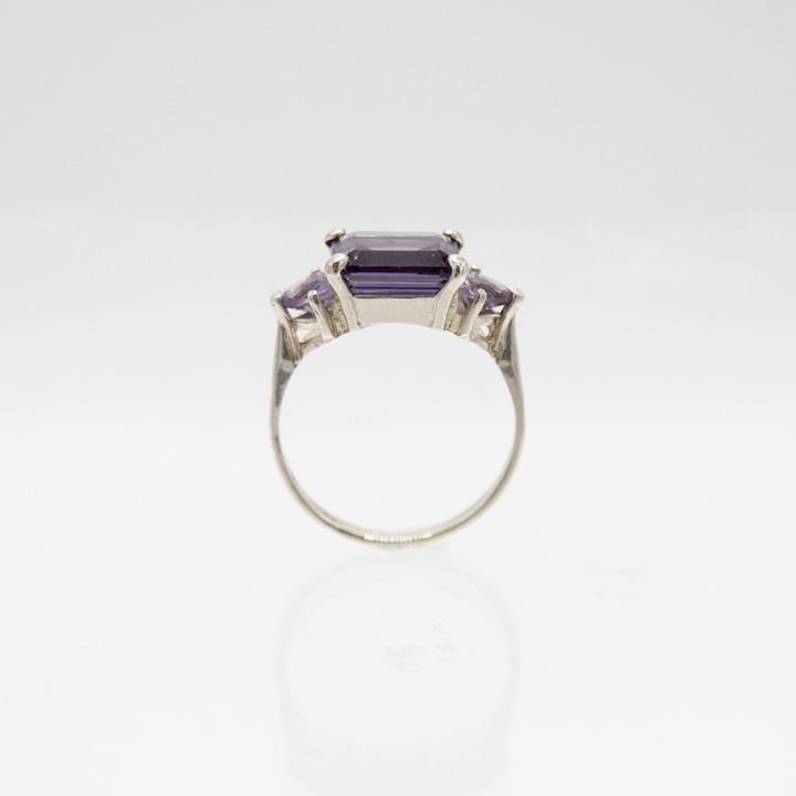 This 3 piece lab grown alexandrite is near flawless and has the same chemical make up as a mined from the earth natural alexandrite would have. The chemical compounds are BeAl2O4 Beryllium aluminum oxide, commonly with small amounts of iron and chromium. The mohs hardness Is an 8.5. This true color change alexandrite Is mounted In Solid .925 sterling silver. Size 9 Ladies get ready for the compliments on this fine ring. The total gram wt. Is 3.5 grams