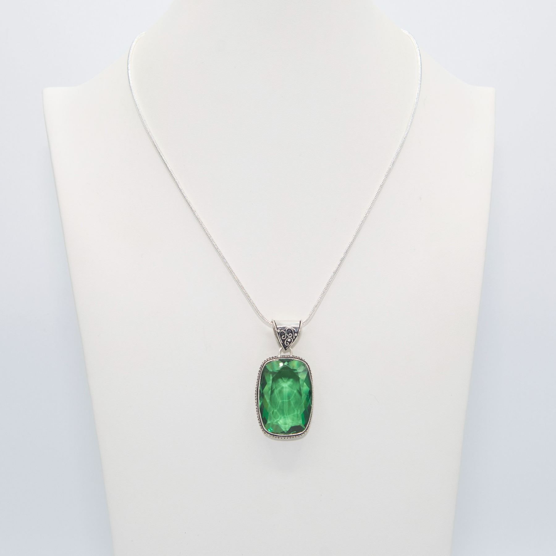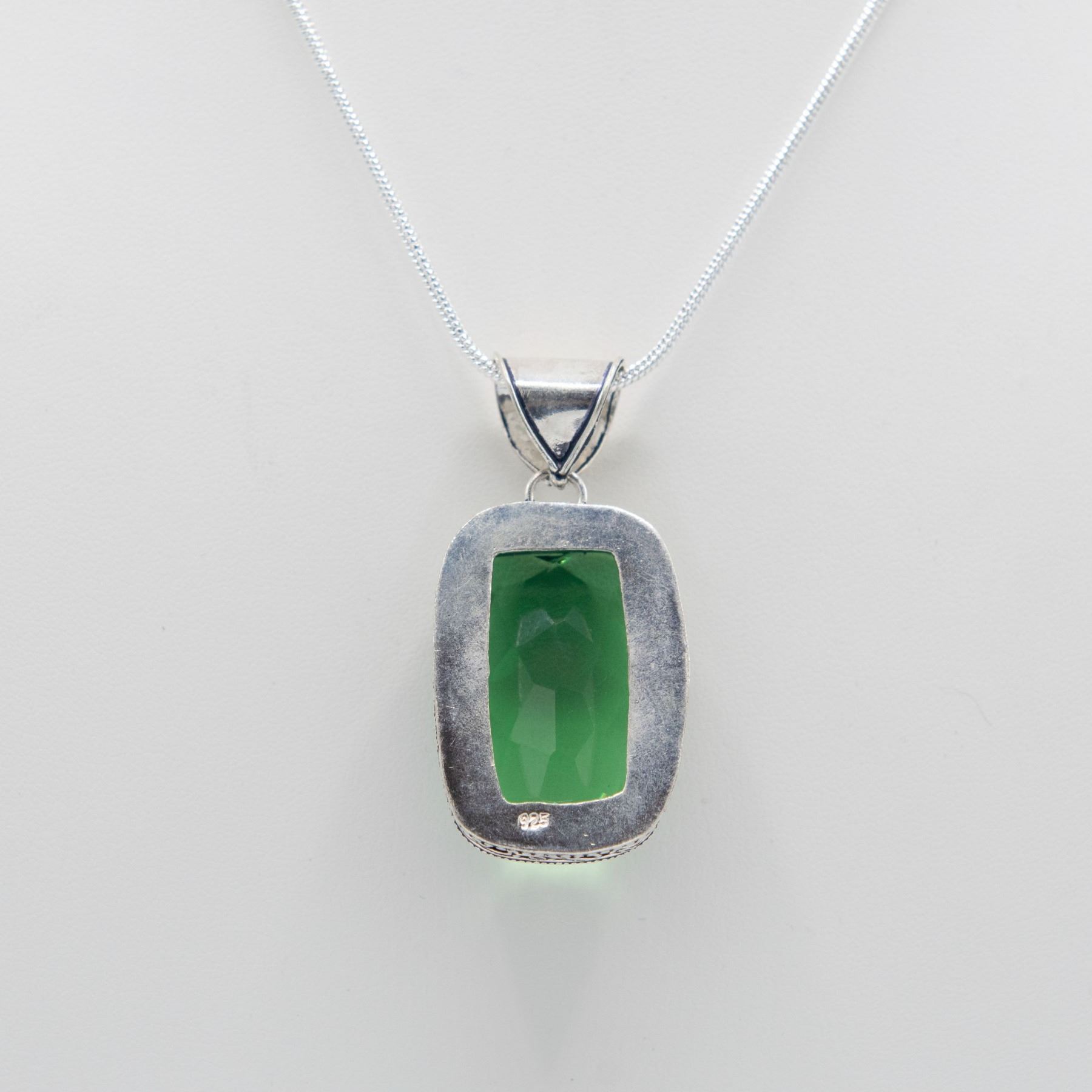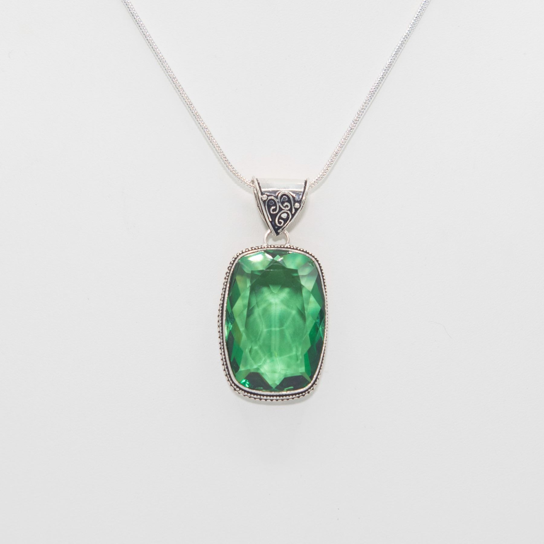 Lab Created 68 Ct Forrest Green Amethyst Pendant. Excellent color saturation and a strong even tone. Mounted in .925 sterling silver overlay. Includes 20 "2 mm chain 147 cttw or 29.3 Total grams. Absolutely stunning.