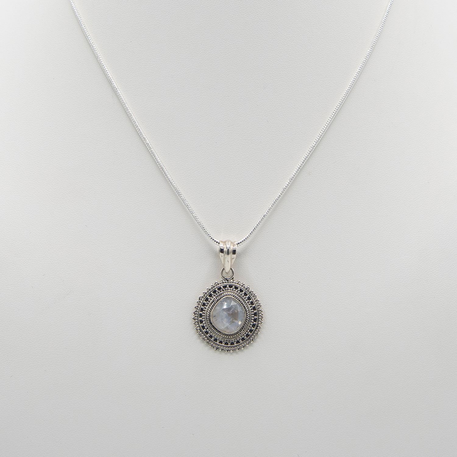 Extremely pretty Luminescent 5 Ct Natural Moonstone Pendant. Rare faceted cushion cut moonstone that shows multiple colors and vivid hue. Mounted in elaborately designed solid .925 stamped sterling silver. Includes 20 "chain.13.3 total gram wt. or 66.5 cttw.