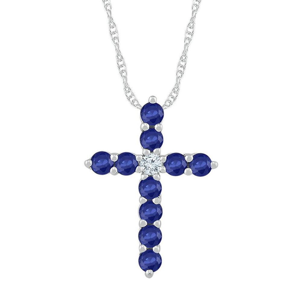 10kt White Gold Womens Round Lab-Created Blue Sapphire Cross Pendant 7/8 Cttw