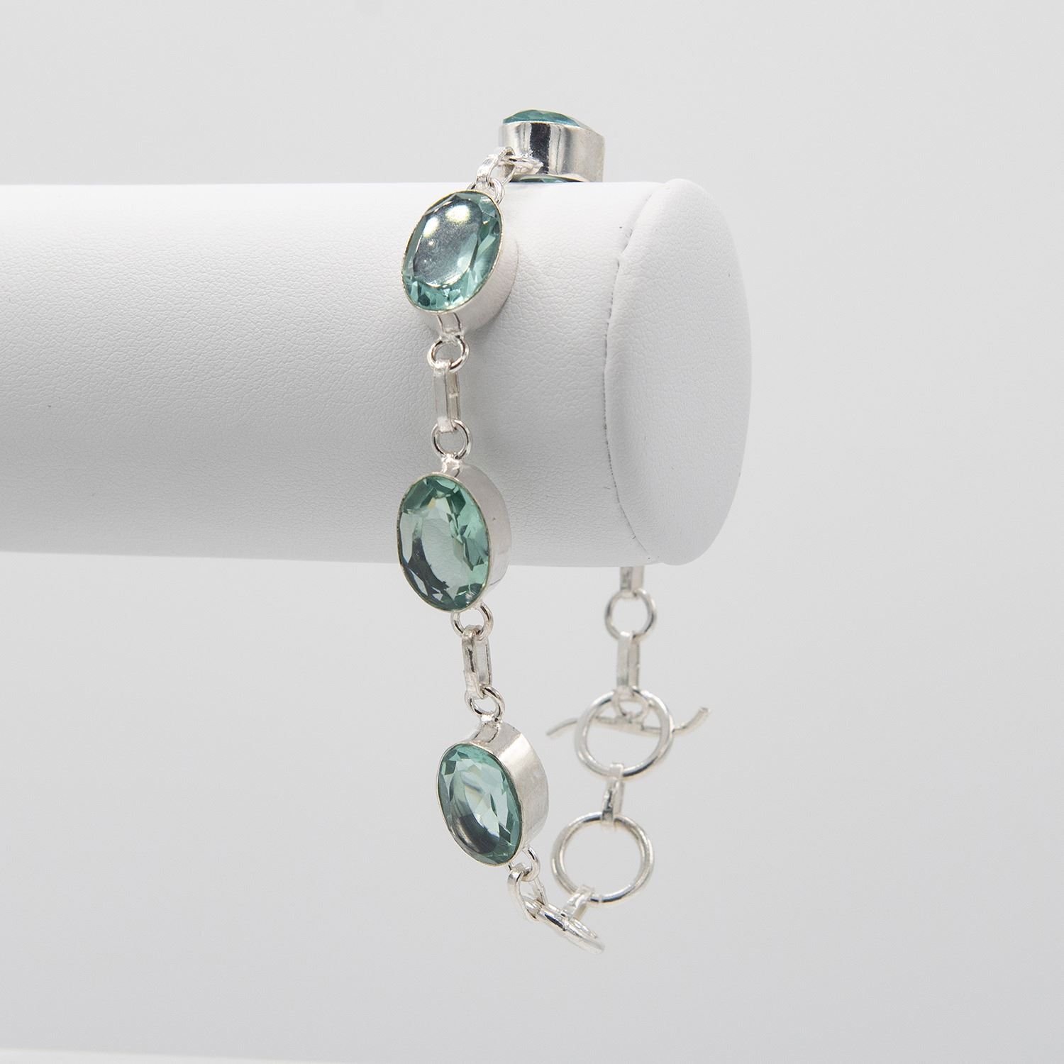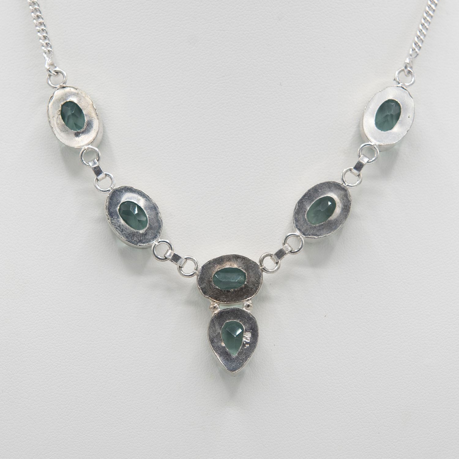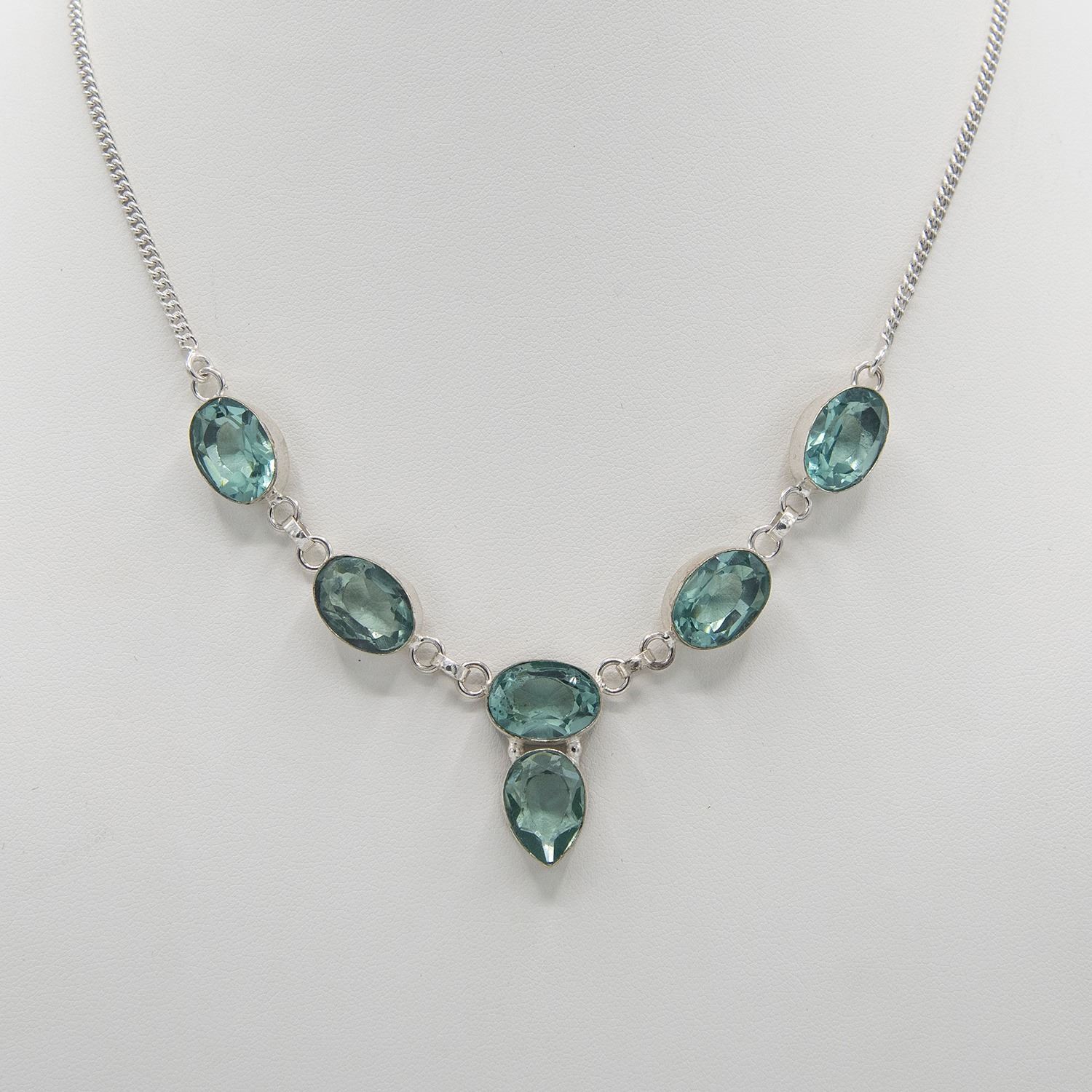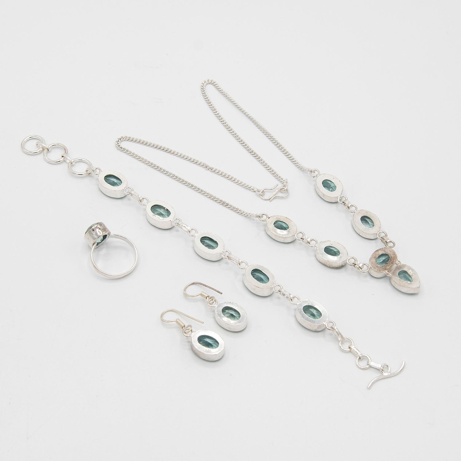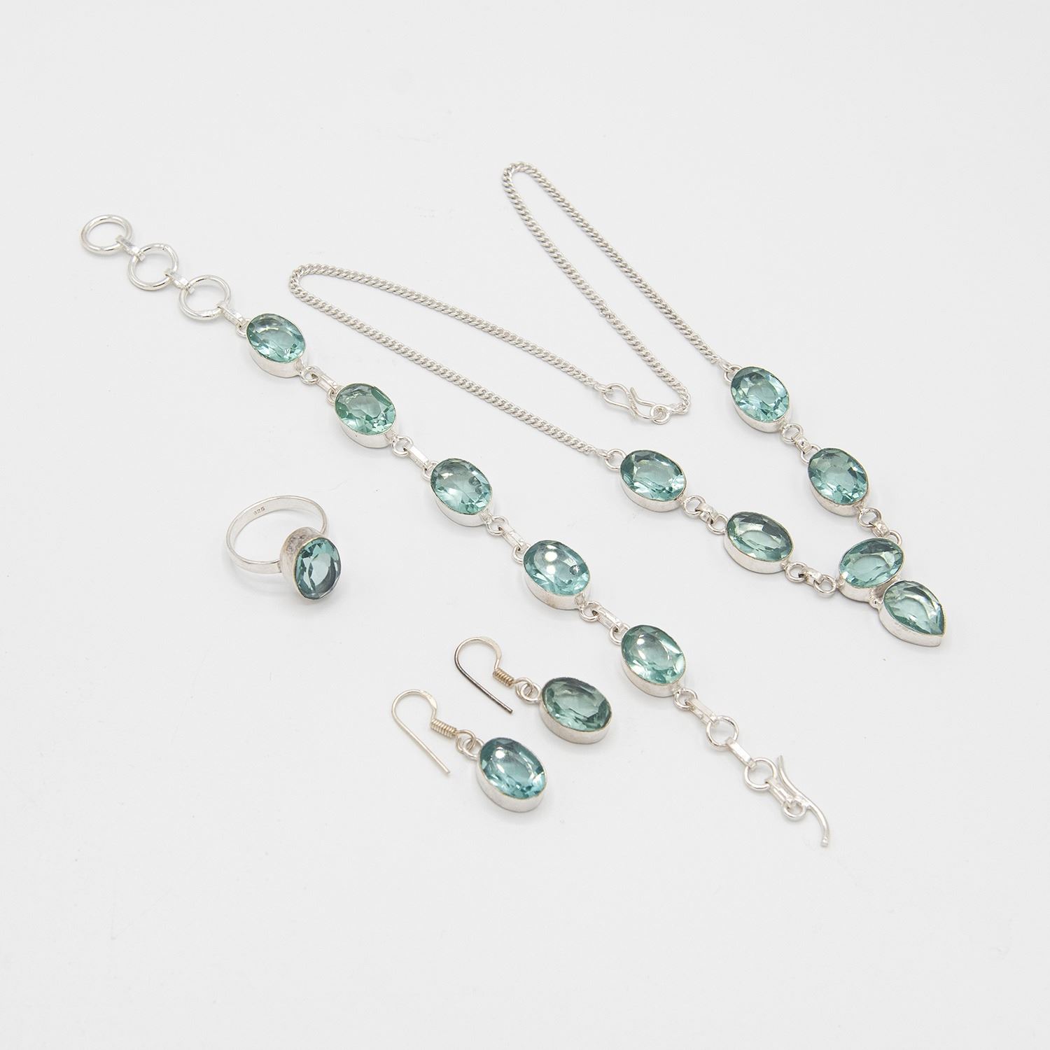 Breathtaking Aquamarine 4 piece Jewelry Set. These lab made gemstones are near flawless. They burst out with a dazzling sparkle and vivid even tone. The 4 piece set includes an 18 inch 6 single stone faceted necklace, bracelet, earrings and finger ring size 8.5.Mounted in .925 stamped sterling silver overlay. Total approximate weight of all pieces is 45.4 grams or 227 cttw.
