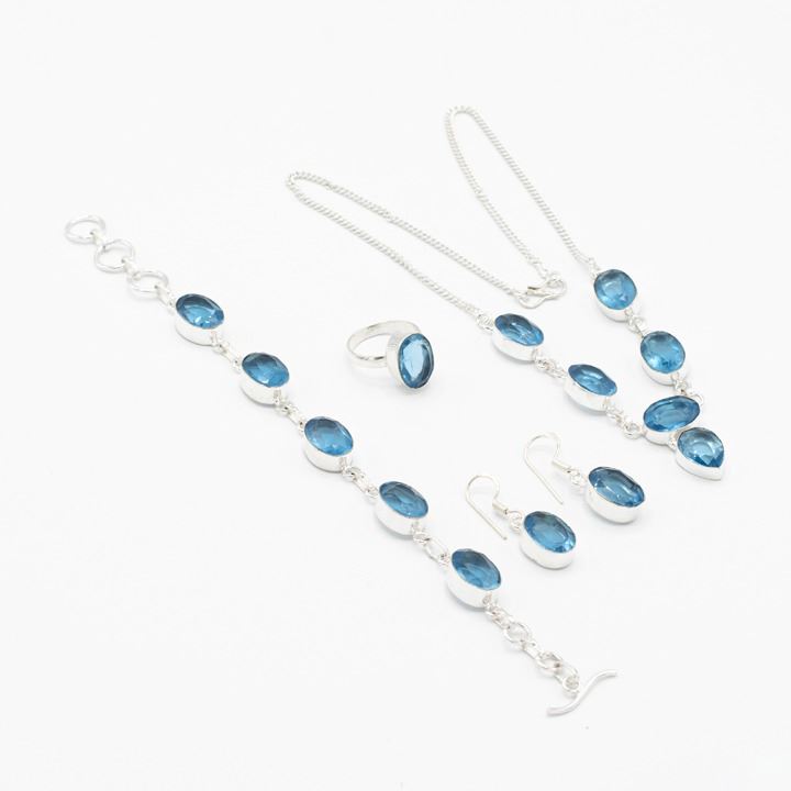 Ladies Swiss Blue Topaz Jewelry Suite. Featuring a matching necklace, bracelet, ring and earrings containing bezel set oval cut lab created blue topaz. Necklace length 18". Bracelet length 8". Total gram weight is 45.1 or 225.5 Cttw.