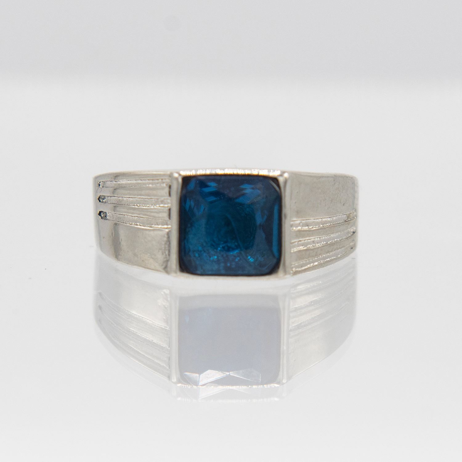 Men's 3.5 Ct Blue Sapphire Ring. This lab created sapphire is a VVS1 eye clean faceted square cut mounted in 14 Kt white gold fill. Will not tarnish or fade with that white gold high polish and shine.6.8 total gram wt. Size 10.