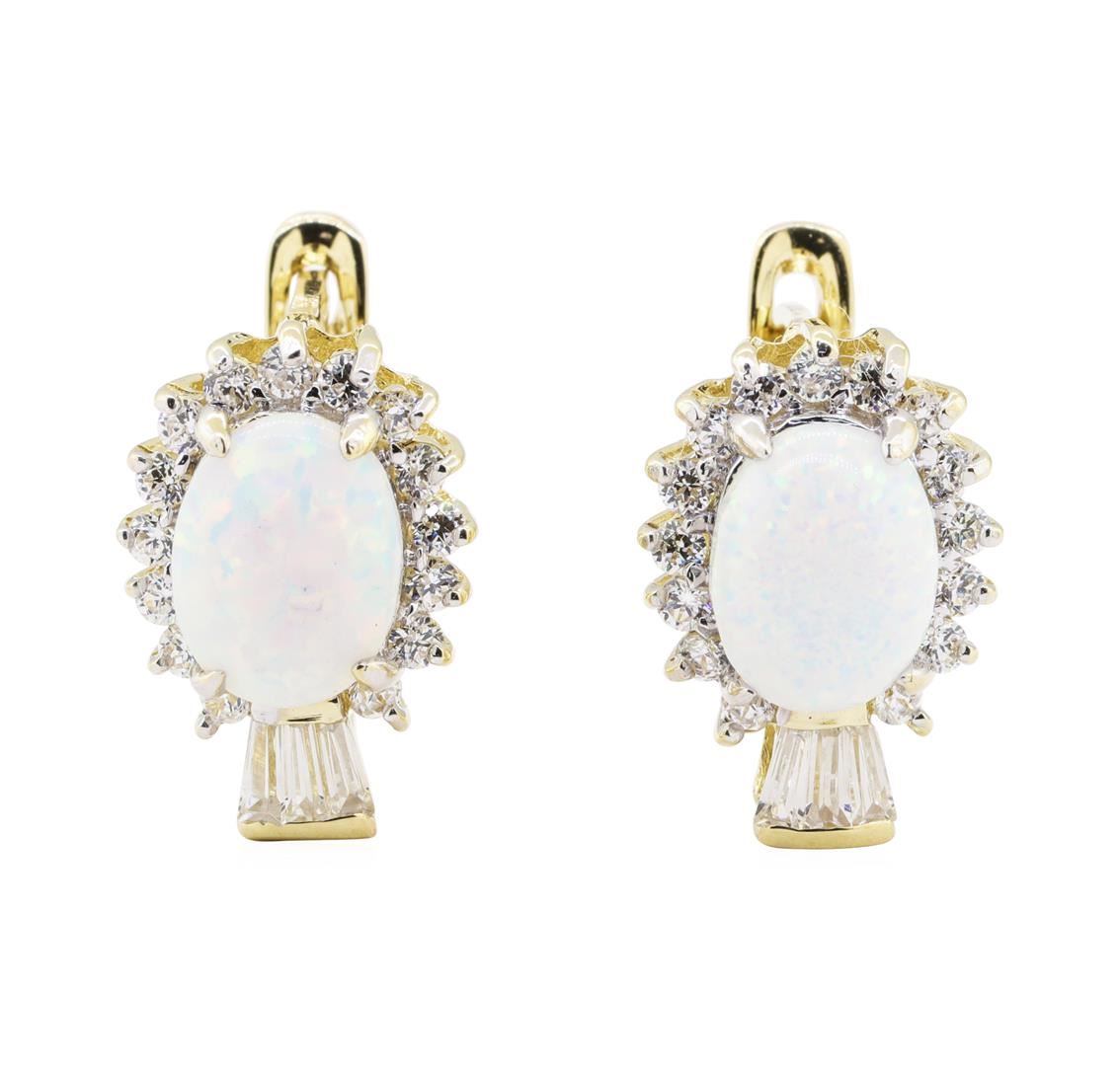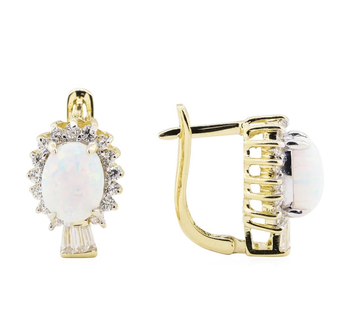 One pair of earrings with hinged locking clasps featuring: 14KT yellow gold weighing 7.3 grams containing lab created opals and cubic zicronias.