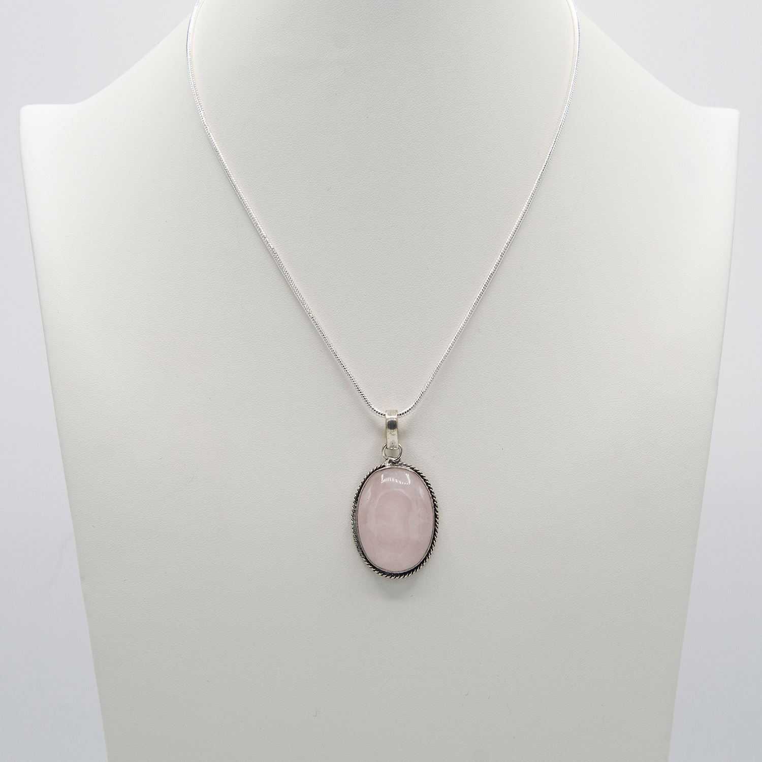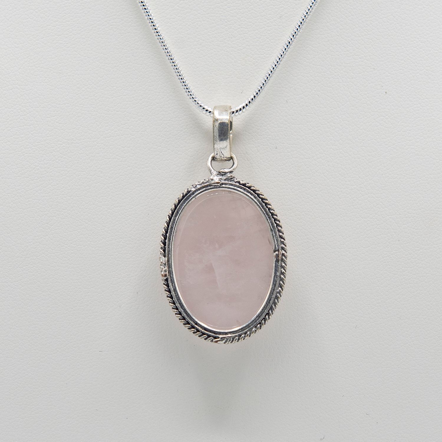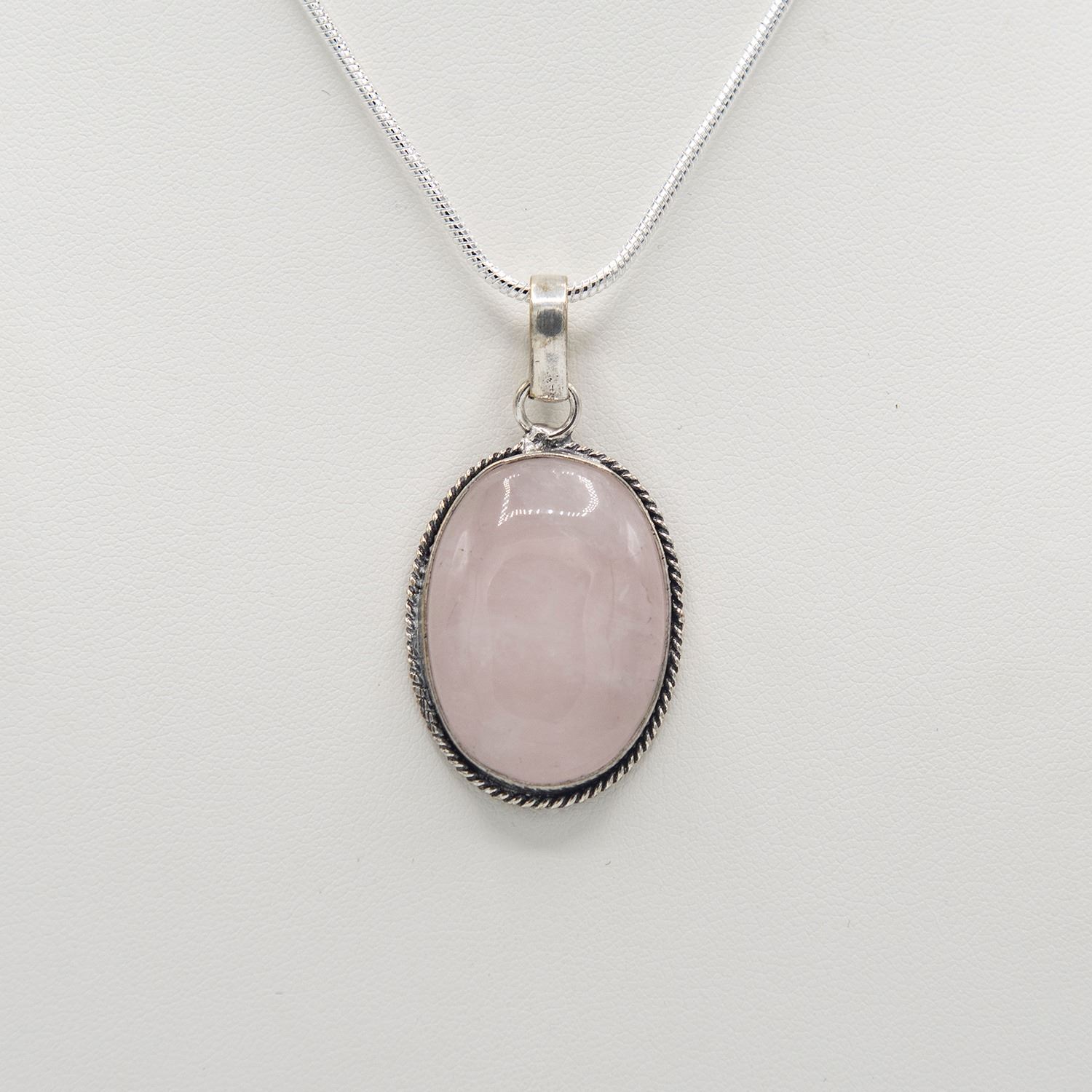 Pretty 30.5 ct natural rose quartz pendant. Soft pink hue. Mounted in elaborately designed .925 sterling silver. Includes 20" 2mm chain. 19.6 total grams or 98 cctw.