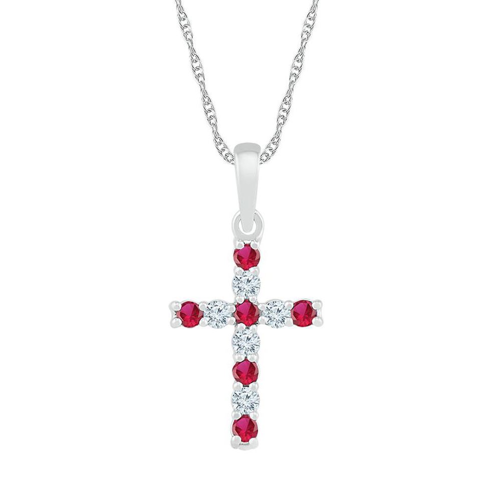 10kt White Gold Womens Round Lab-Created Ruby Faith Cross Pendant 3/8 Cttw
