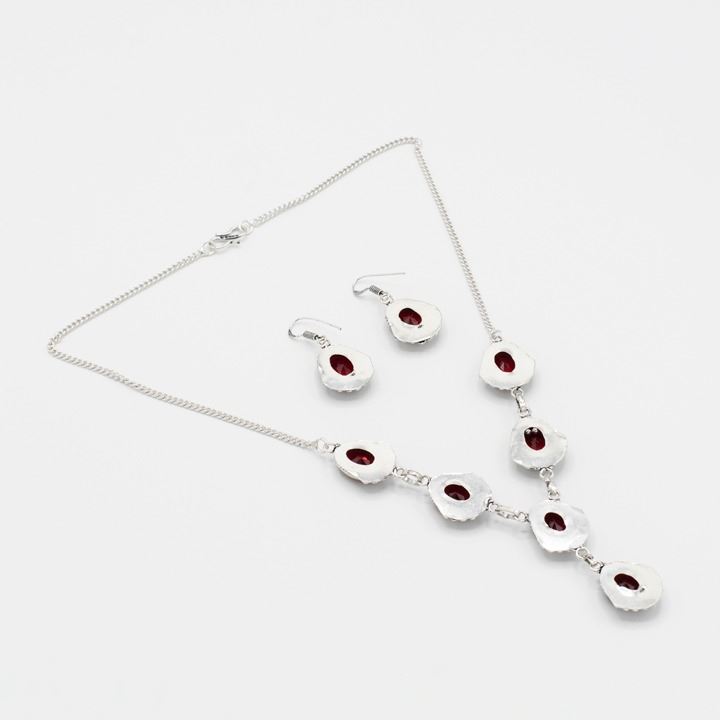 Pretty Lab Ruby Necklace And Earring 2 Piece Set. These lab created rubies are near flawless. Displaying a beautiful pigeon blood red hue with 360 degree even saturation. 18" long mounted in .925 sterling silver overlay. 32.3 gram total weight.