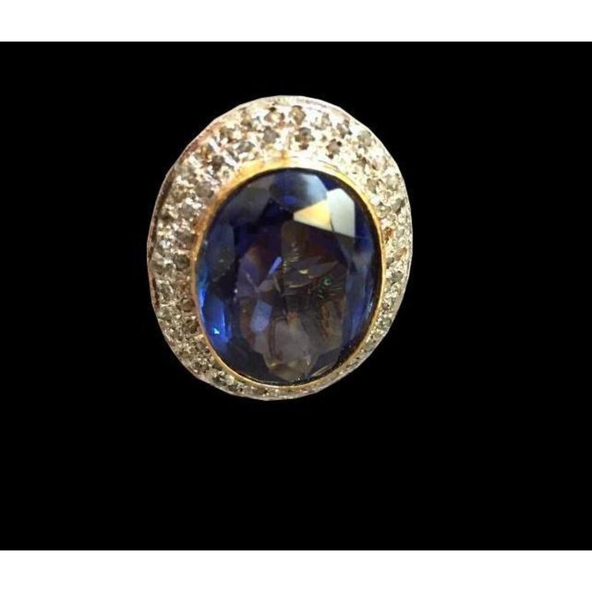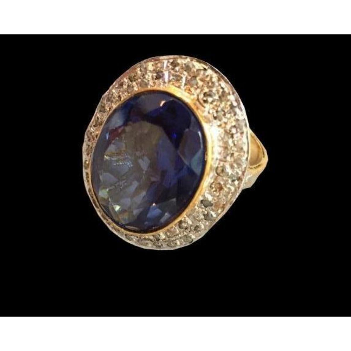 Large & fabulous oval faceted lab-created sapphire, with 2.55ctw diamonds, set in a gold plate over sterling silver ring setting. Size 6.Â