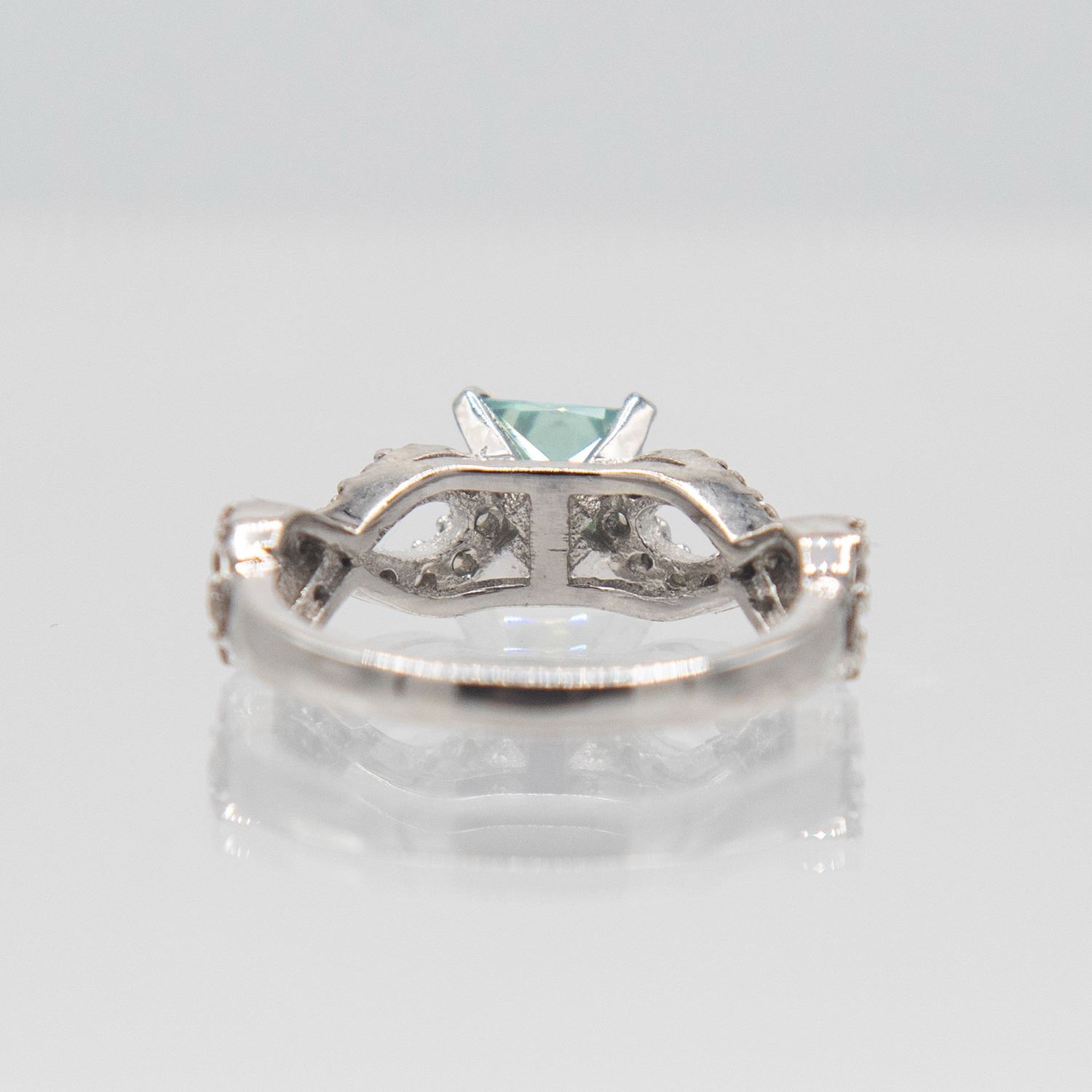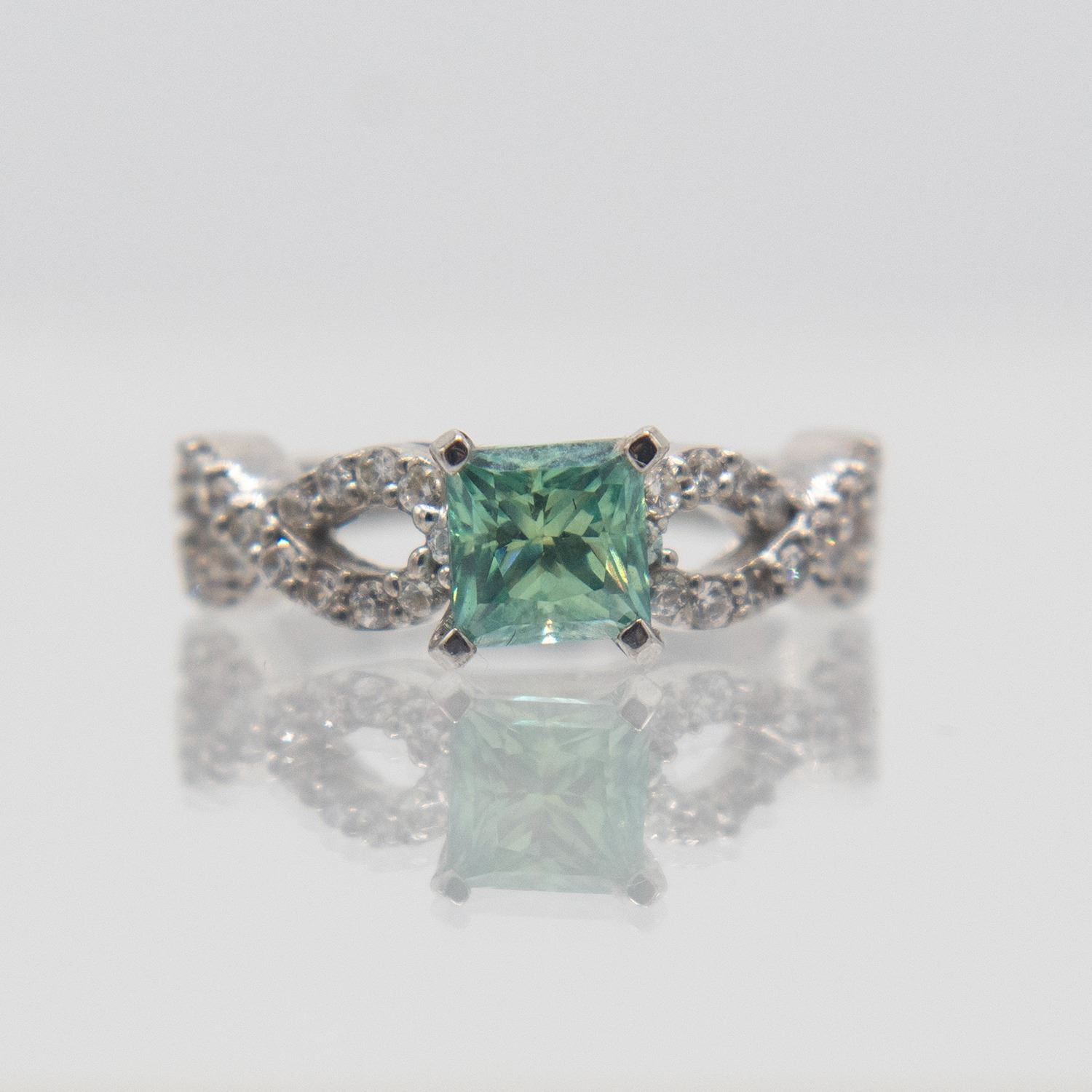 Sparkling 2.5 Ct VVS1 Mint Green Moissanite Ring. This lab created Moissanite center stone is near flawless. It will test positive for a diamond on almost every single diamond tester. This is a fancy square cut mounted in solid .925 sterling silver complimented by rhodium which is a precious metal that is in the family of platinum. Rhodium overlay gives the silver a white gold shine polish and finish. It is also tarnish resistant. The ring also has brilliant round cut cz accent stones. The ring is a size 7.5.Total gram wt. is approx.3.3 grams. This Lab Moissanite Exhibits More Brilliance Than A Diamond Thanks To A Dispersion That Is 2.4 Times Higher Than A Natural Diamond And Conflict Free.