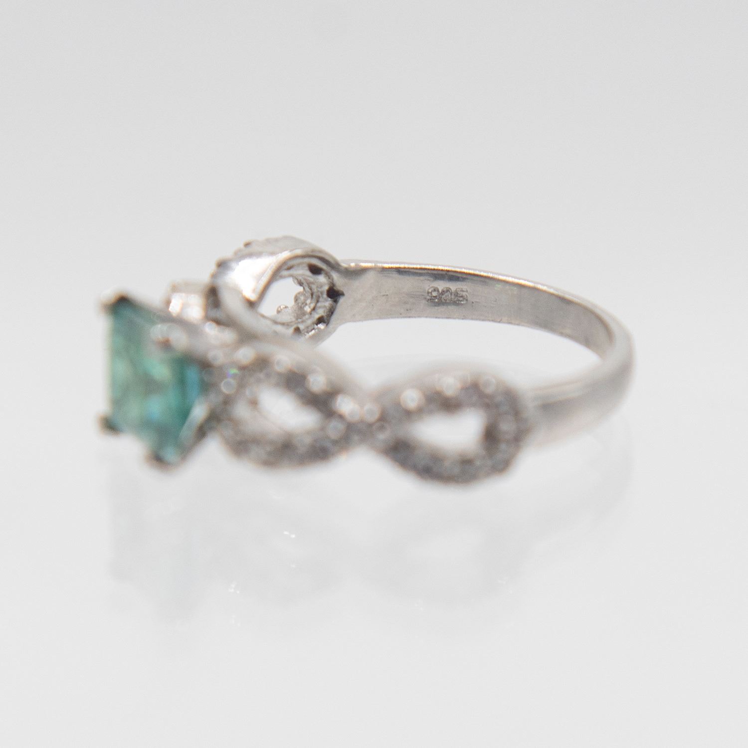 Sparkling 2.5 Ct VVS1 Mint Green Moissanite Ring. This lab created Moissanite center stone is near flawless. It will test positive for a diamond on almost every single diamond tester. This is a fancy square cut mounted in solid .925 sterling silver complimented by rhodium which is a precious metal that is in the family of platinum. Rhodium overlay gives the silver a white gold shine polish and finish. It is also tarnish resistant. The ring also has brilliant round cut cz accent stones. The ring is a size 7.5.Total gram wt. is approx.3.3 grams. This Lab Moissanite Exhibits More Brilliance Than A Diamond Thanks To A Dispersion That Is 2.4 Times Higher Than A Natural Diamond And Conflict Free.