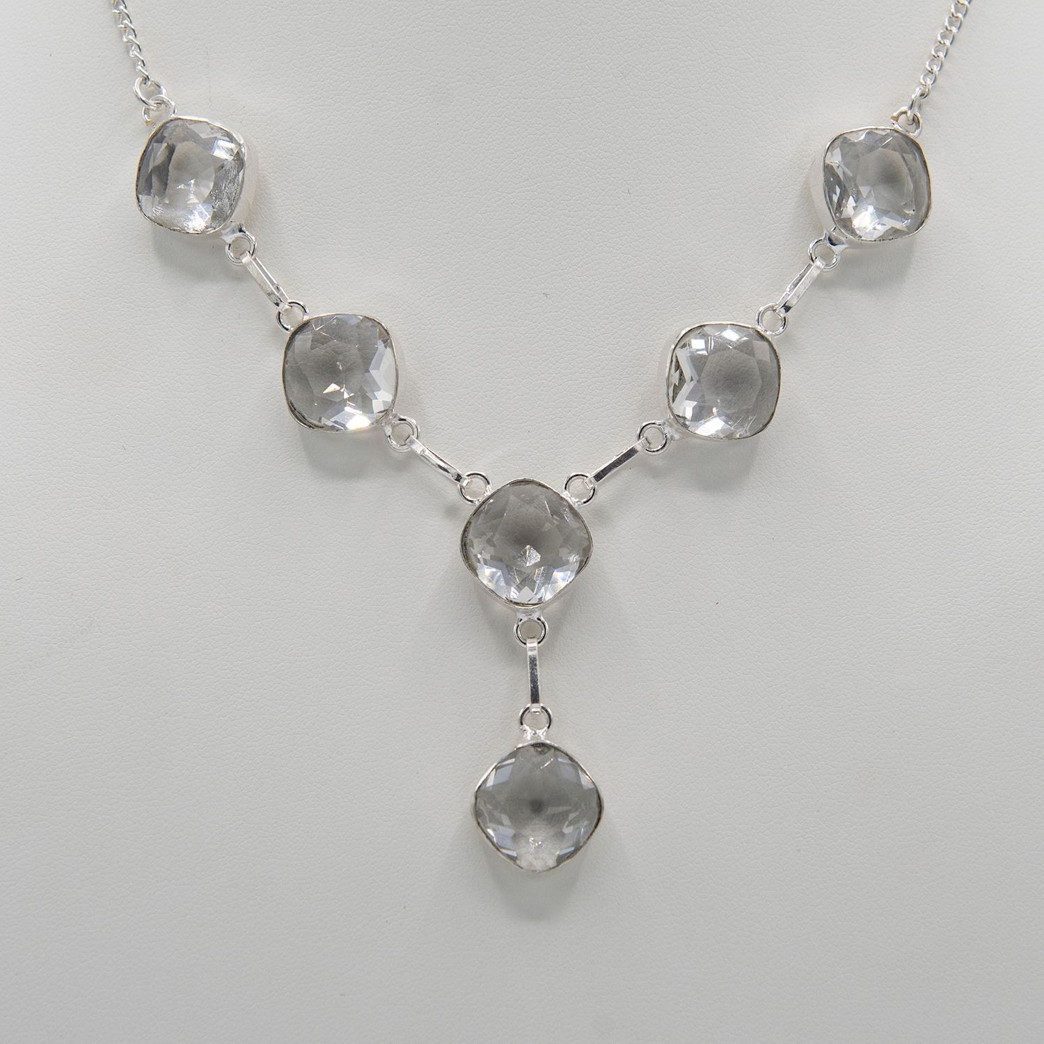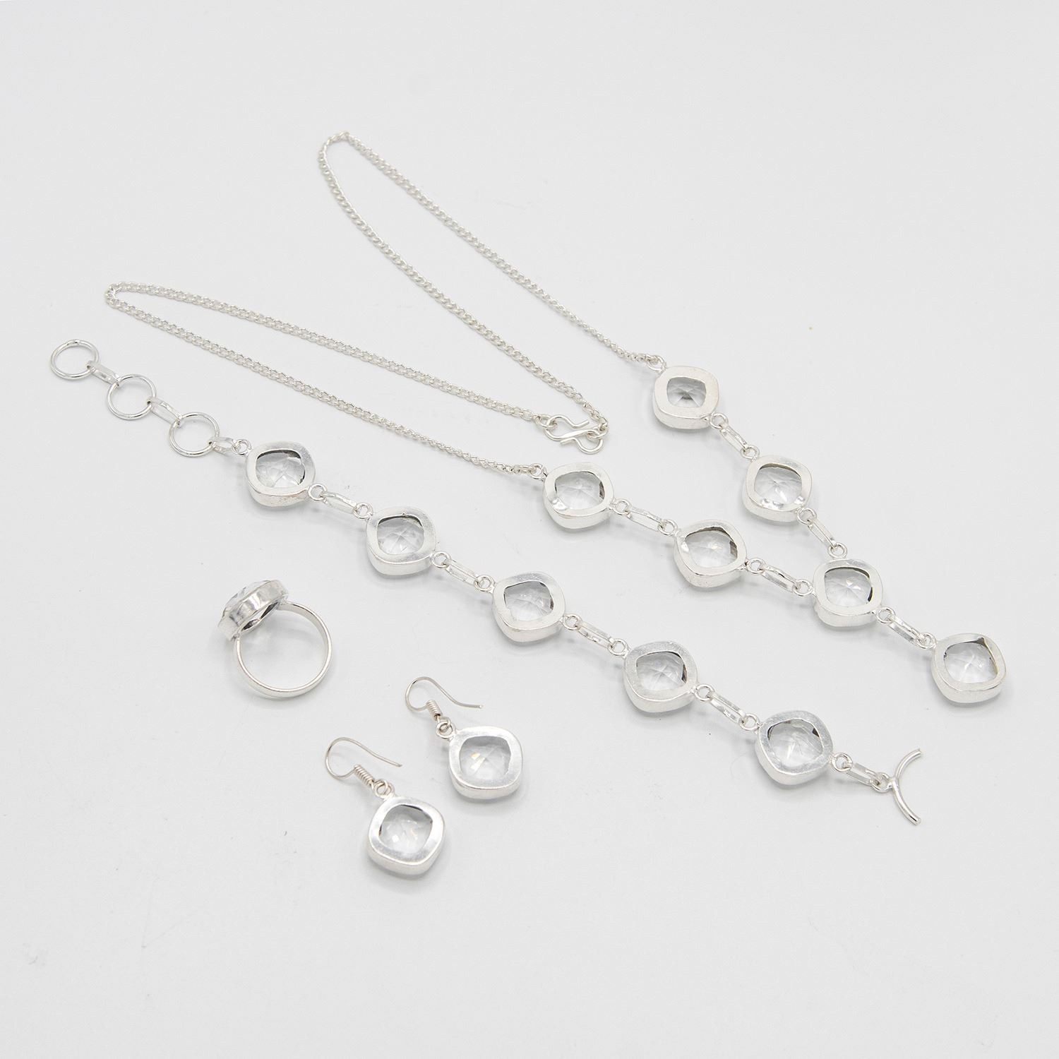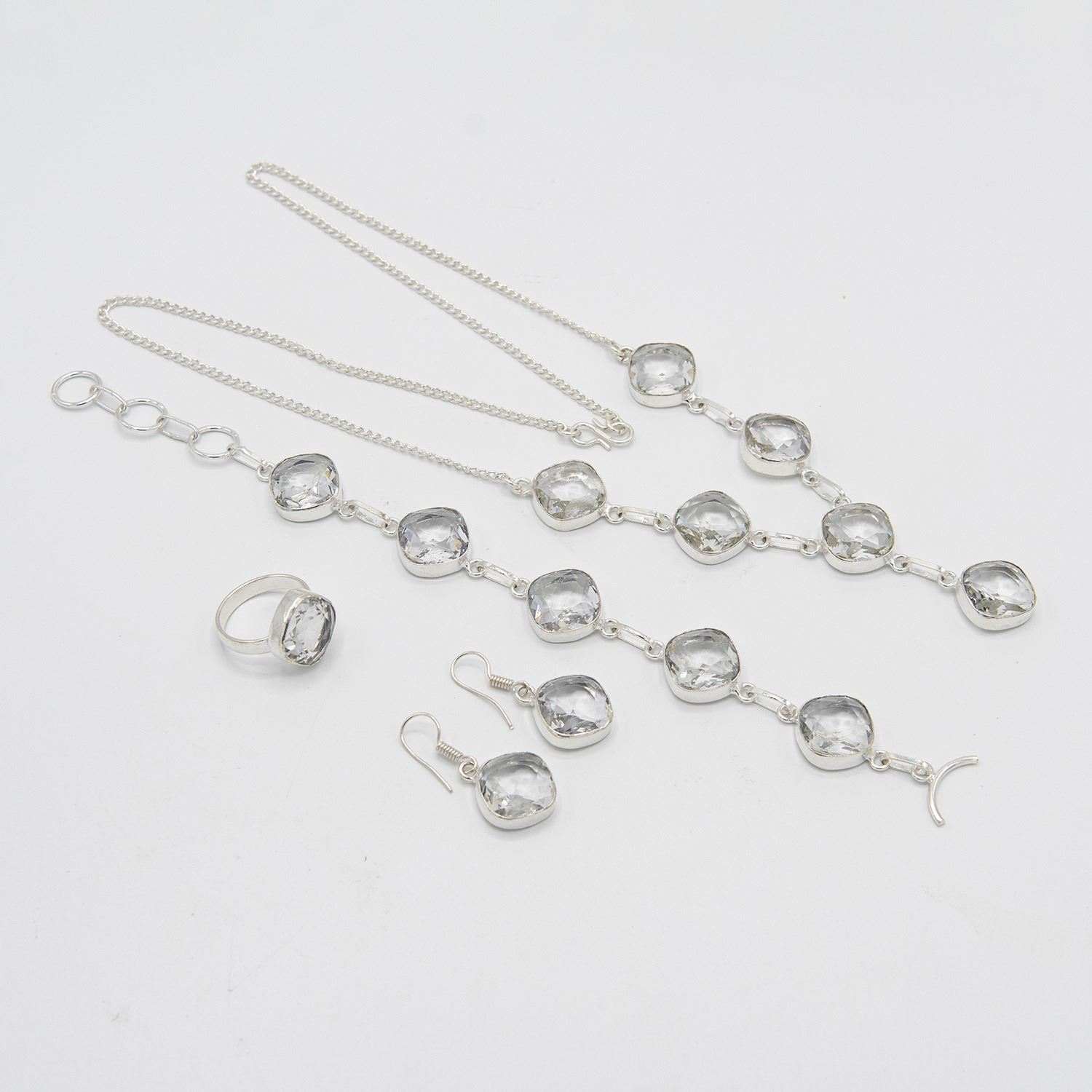 Sparkling 4 Piece White Topaz Jewelry Set. These lab made topaz are near flawless. They burst out with a dazzling sparkle and vivid even tone. The 4 piece set includes an 18 inch 6 single stone faceted necklace, bracelet, earrings and finger ring size 6.5. Mounted in .925 stamped sterling silver overlay. Total approximate weight of all pieces is 46.4 grams or 232 Cttw.