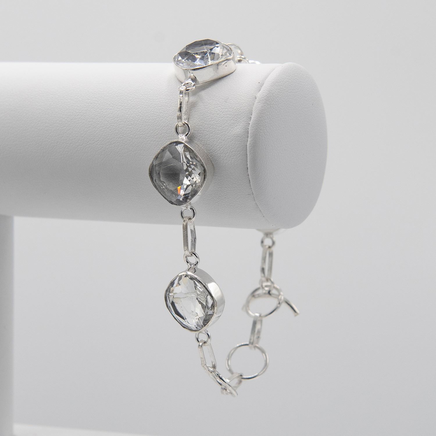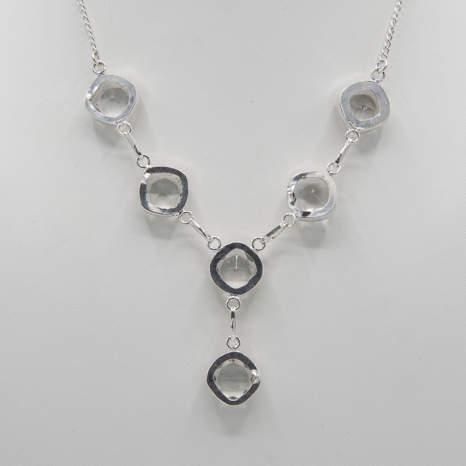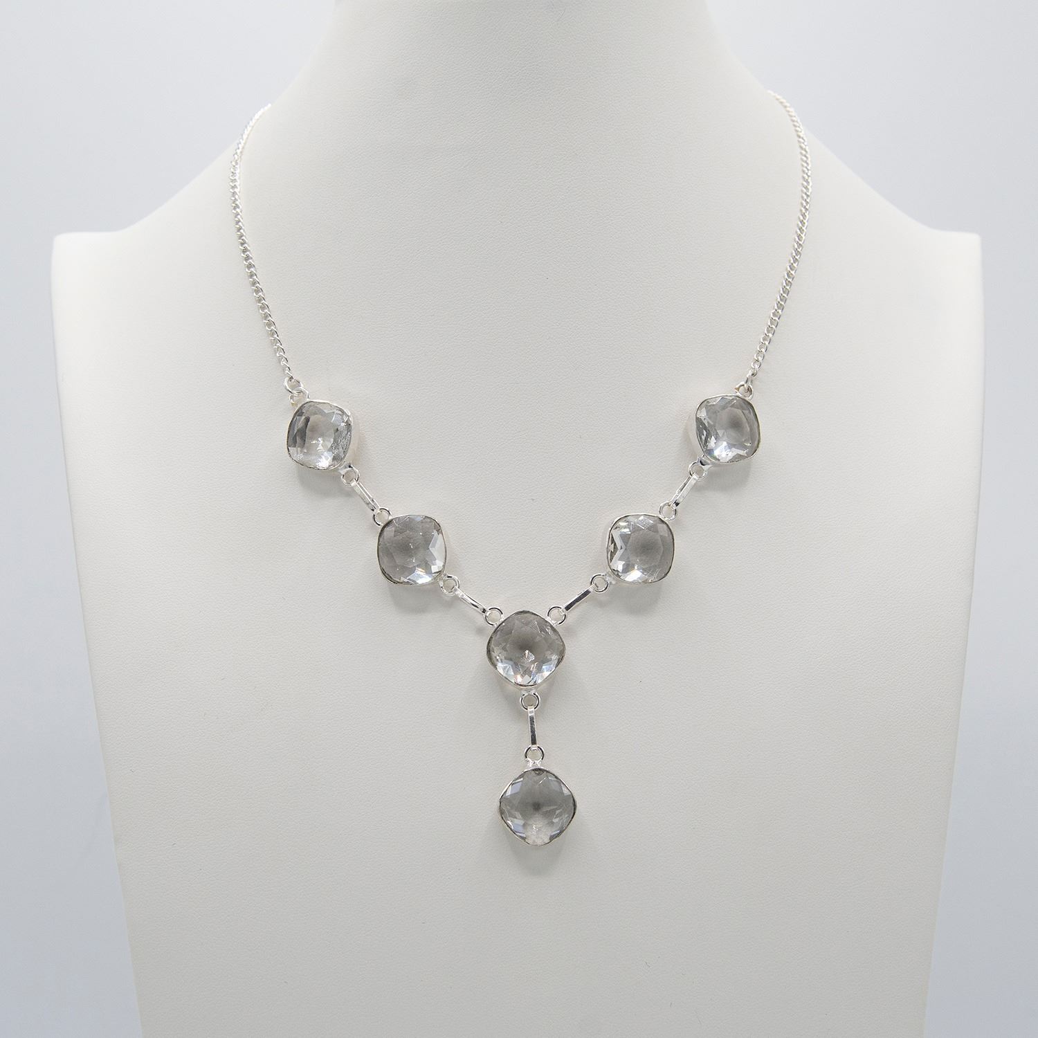 Sparkling 4 Piece White Topaz Jewelry Set. These lab made topaz are near flawless. They burst out with a dazzling sparkle and vivid even tone. The 4 piece set includes an 18 inch 6 single stone faceted necklace, bracelet, earrings and finger ring size 6.5. Mounted in .925 stamped sterling silver overlay. Total approximate weight of all pieces is 46.4 grams or 232 Cttw.