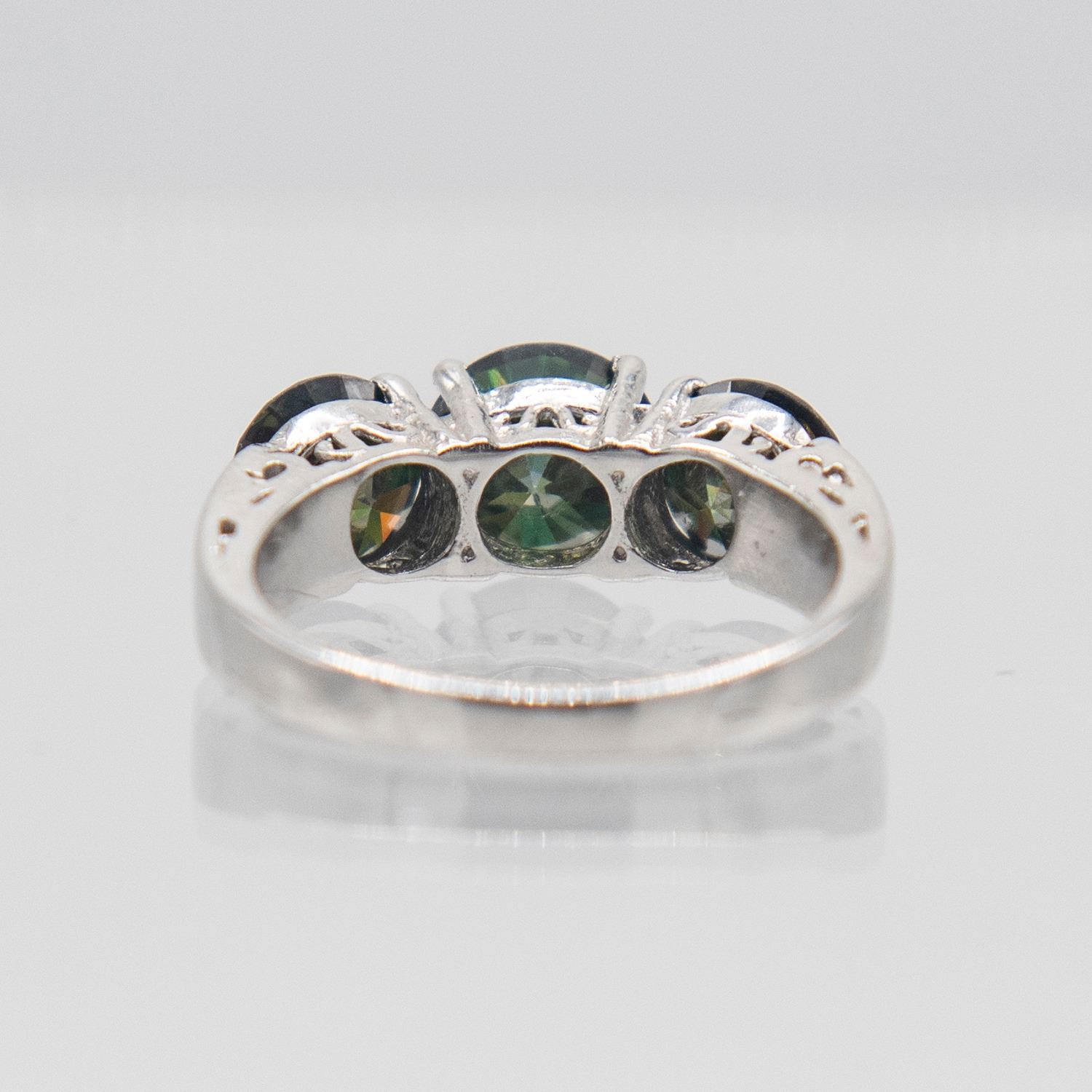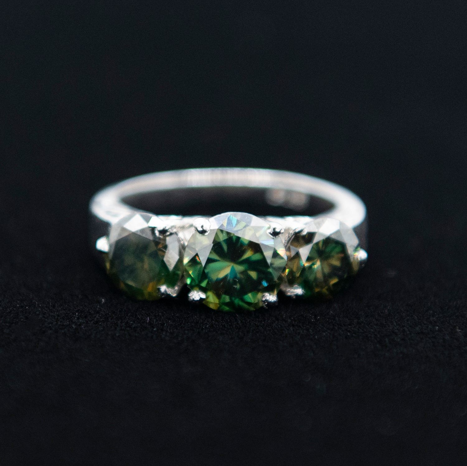 Sparkling 5.5 Cttw VVS1 Emerald Green Diamond Ring. These 3 lab created diamonds are near flawless brilliant round diamond cuts. They will test positive for a diamond on almost every single diamond tester. These 3 brilliant rounds are mounted in solid .925 sterling silver complimented by rhodium which is a precious metal that is in the family of platinum. Rhodium overlay gives the silver a white gold shine polish and finish. It is also tarnish resistant. The ring is a size 7.5.Total gram wt. is approx.4.5 grams.