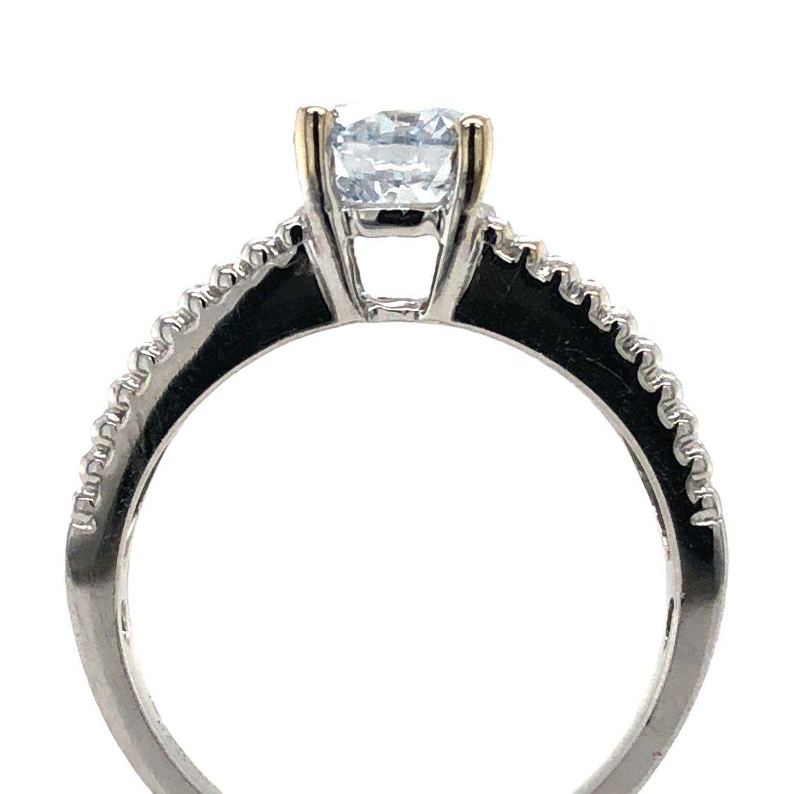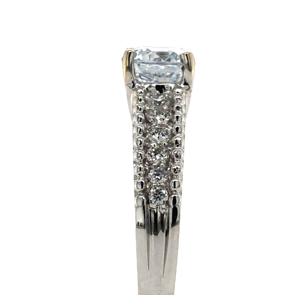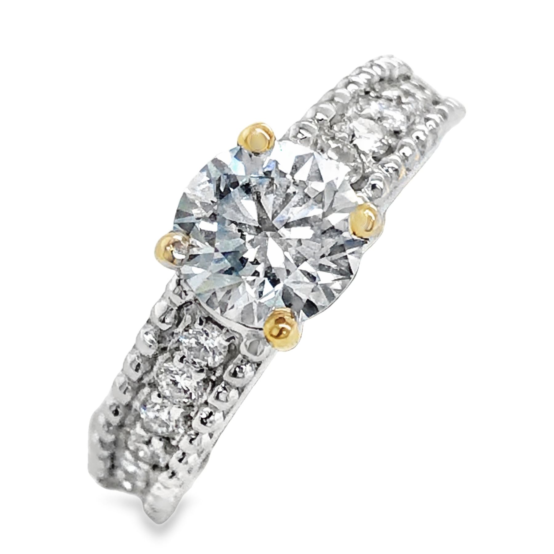 DESCRIPTION DETAIL: This diamond ring features a 1.10 Carat Lab-grown center diamond with approximately .27 carats total weight in natural diamonds on the shoulders.