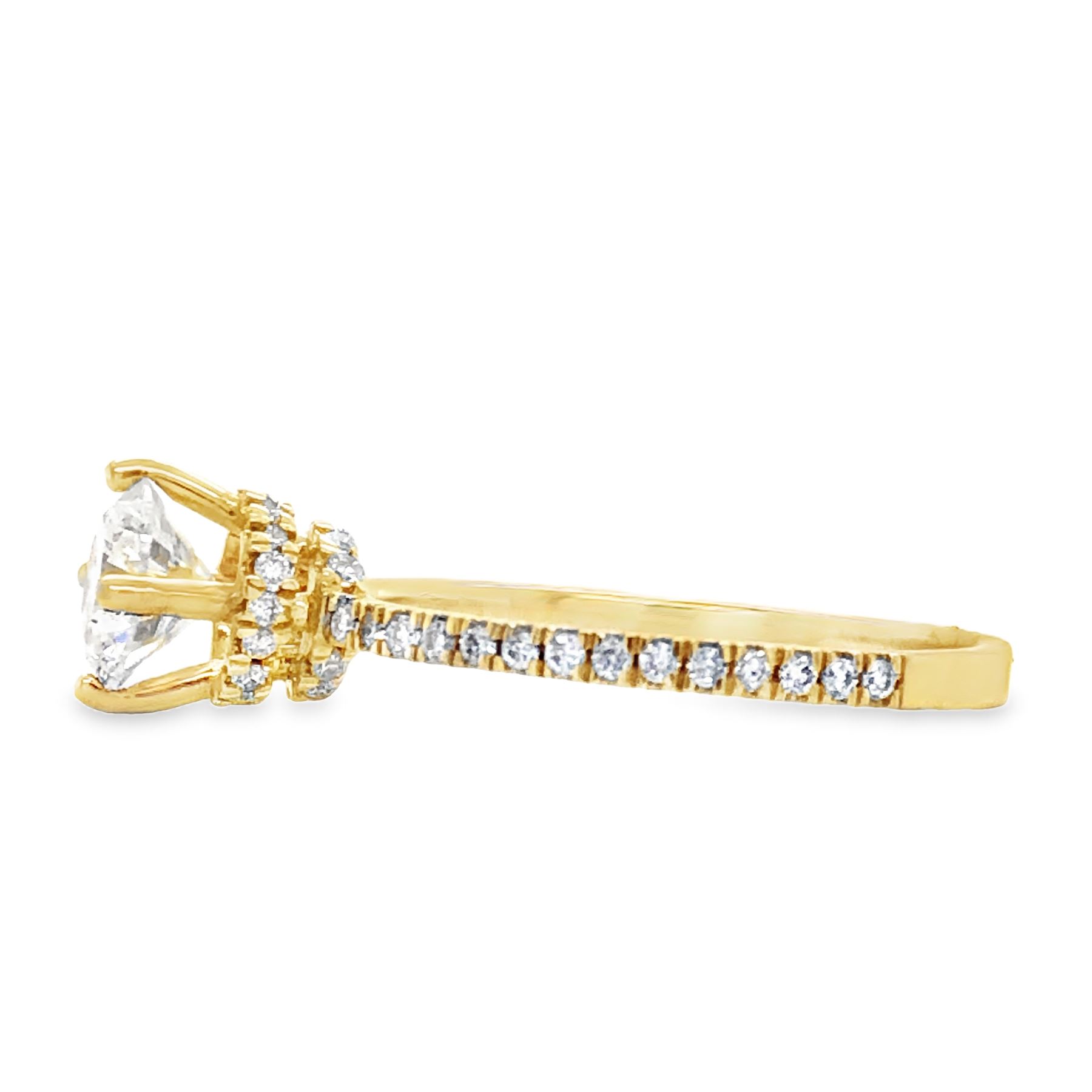 DESCRIPTION DETAIL: This lovely lab grown center diamond is beautifully complimented by a halo of natural diamonds.