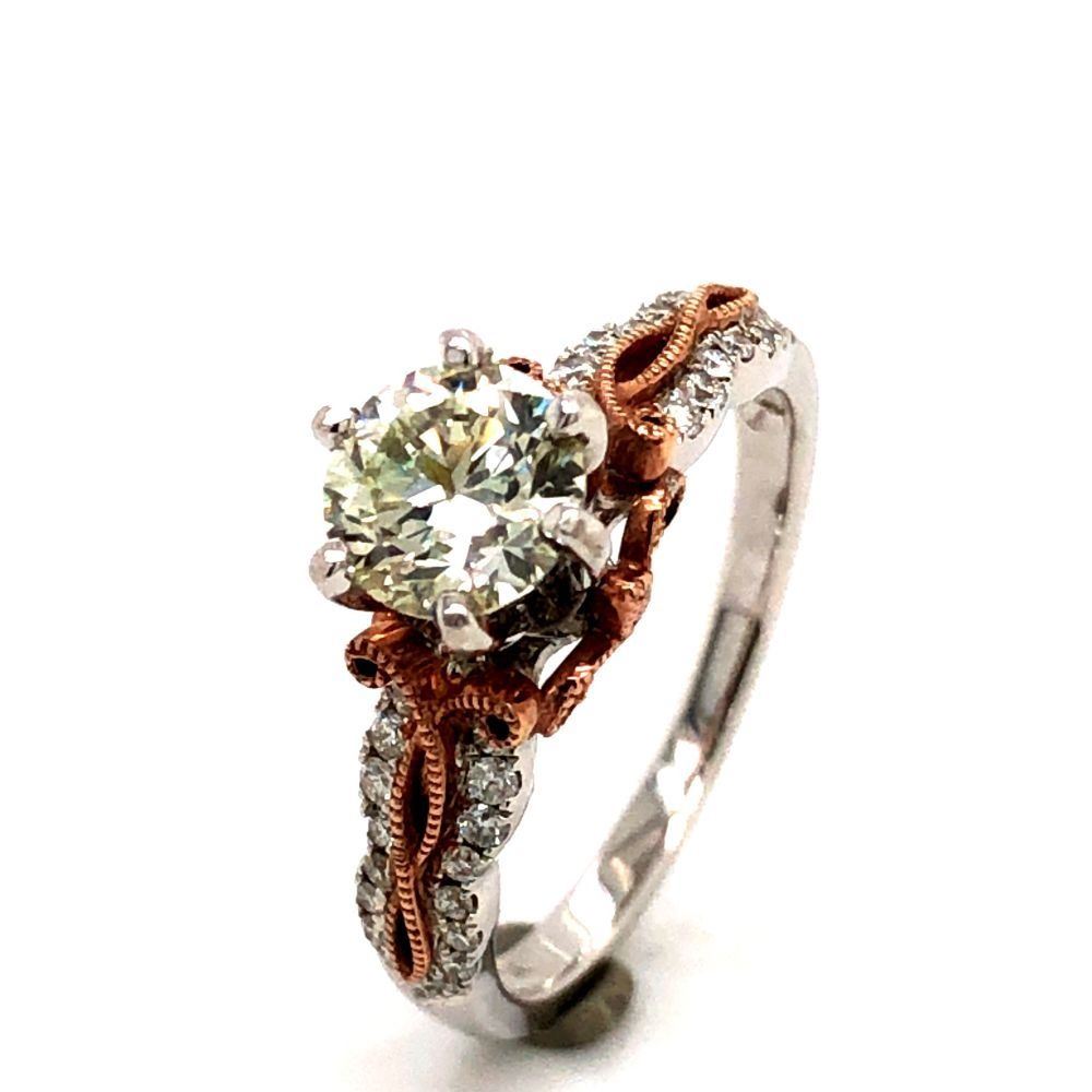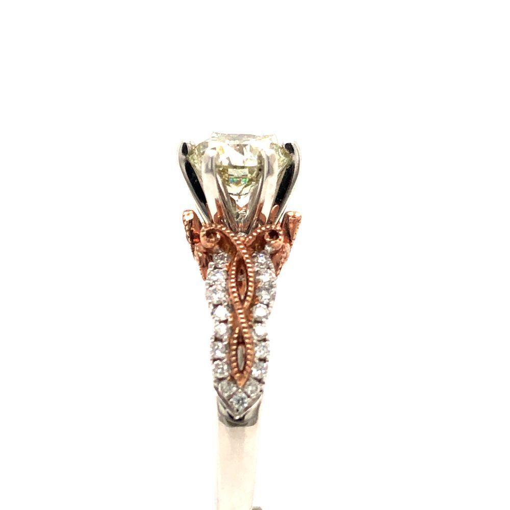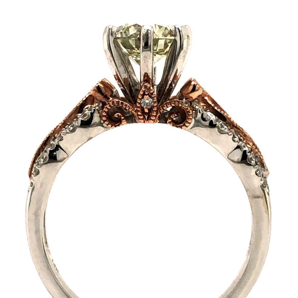 ADDITIONAL INFORMATION:& nbsp; This lab-grown diamond has amazing brilliance with red, blue, green, and yellow flash.& nbsp; The rose gold adds soft, curving designs that meet in the middle with a fleur de lis.& nbsp;& nbsp;