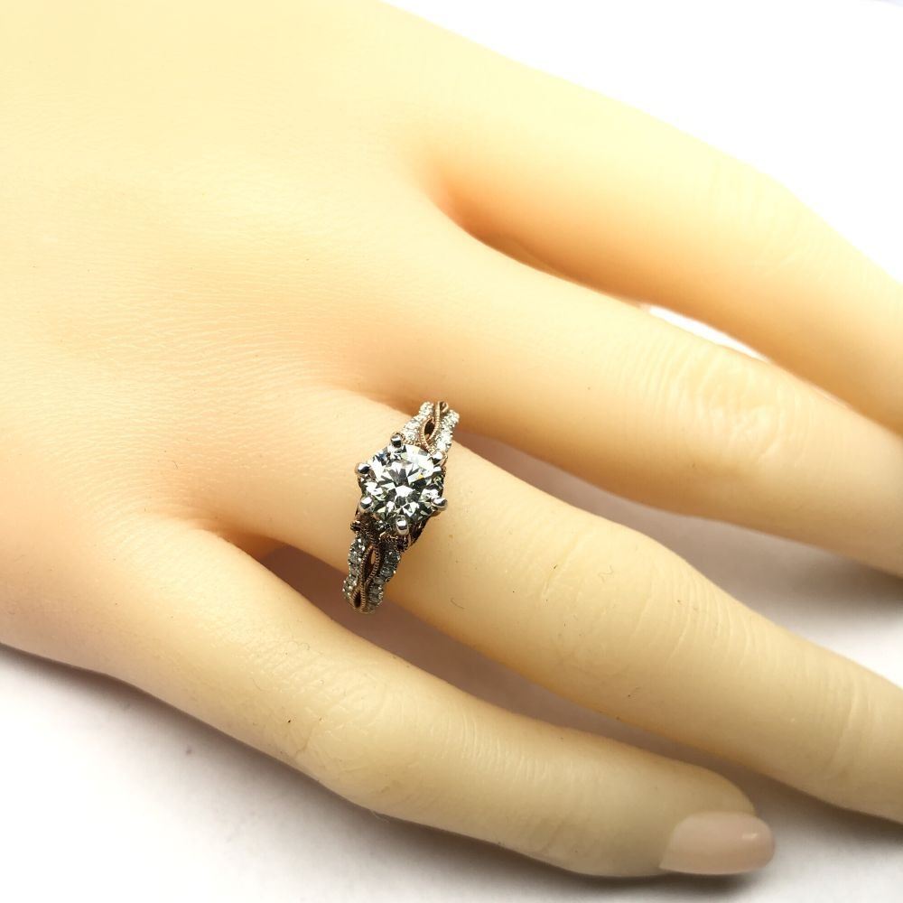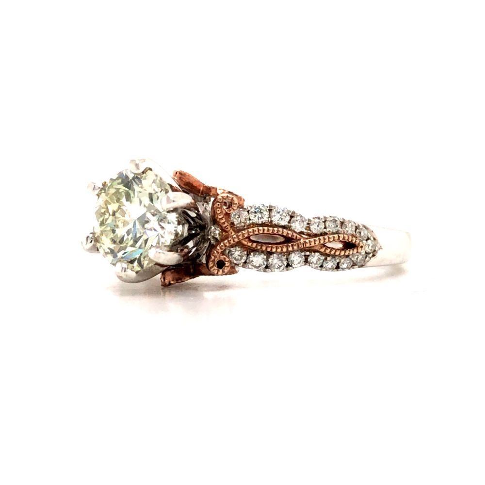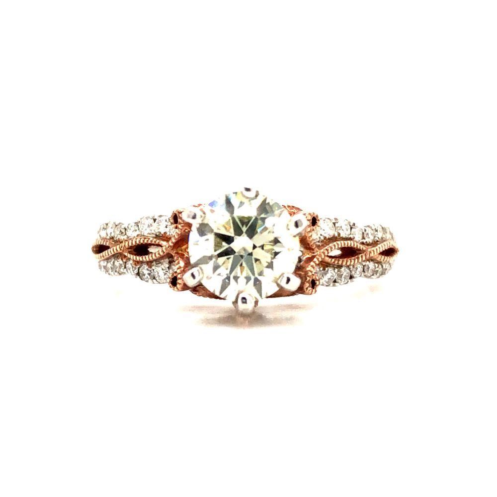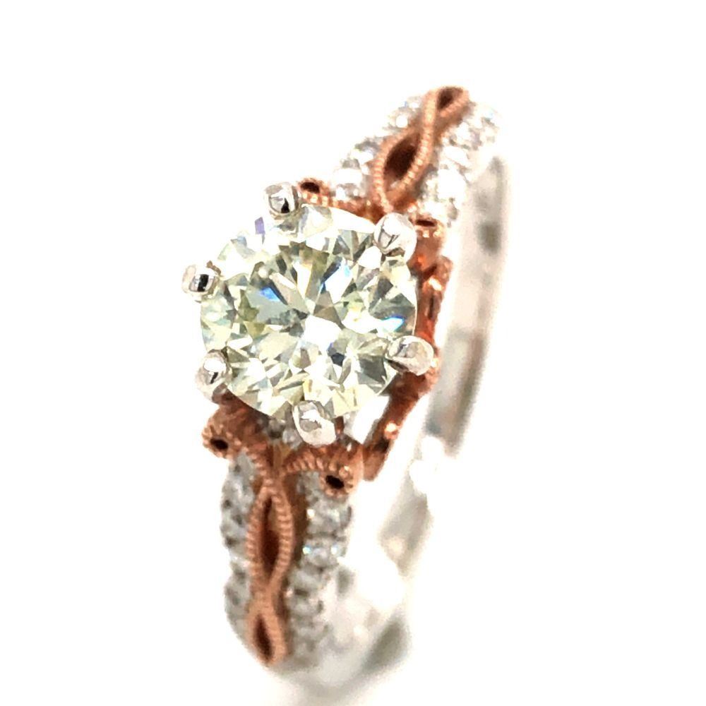 ADDITIONAL INFORMATION:& nbsp; This lab-grown diamond has amazing brilliance with red, blue, green, and yellow flash.& nbsp; The rose gold adds soft, curving designs that meet in the middle with a fleur de lis.& nbsp;& nbsp;