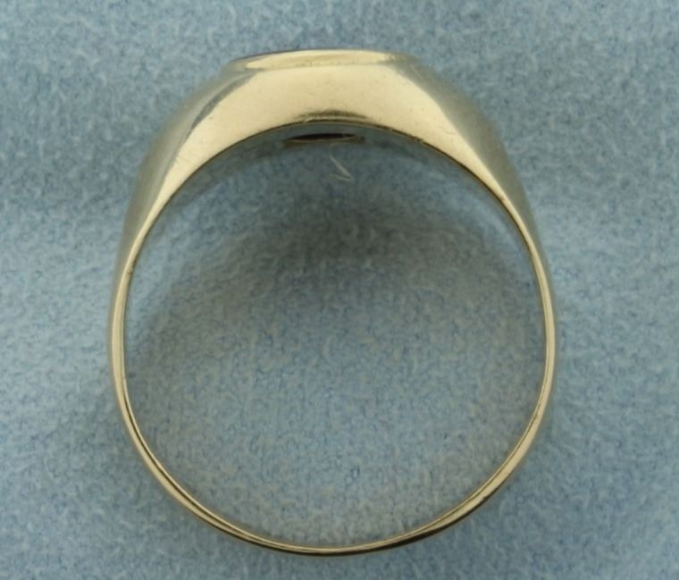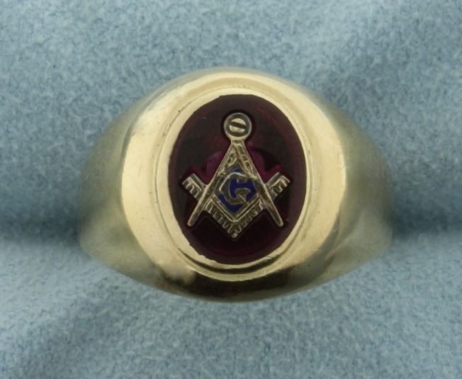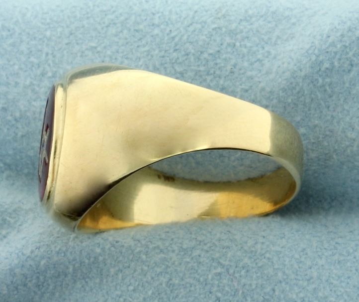 In 10k yellow gold. Contains a lab 11x9mm ruby with the Masonic logo centered in it. Size 11 1/2. 5.3g.