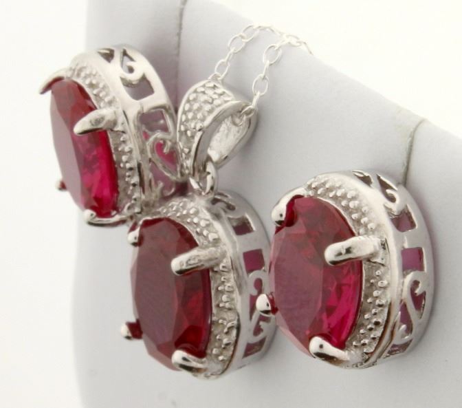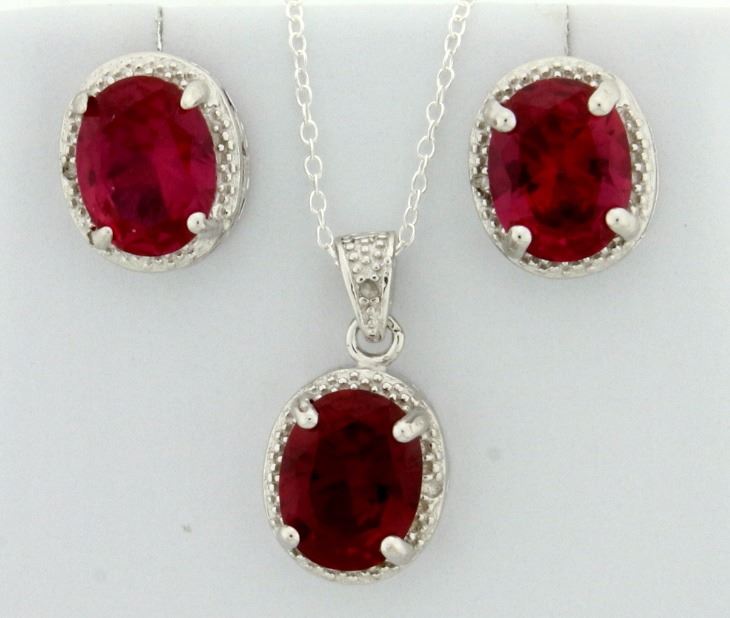Classic genuine lab Ruby gemstones measure 7x9mm with 0.02ctw genuine Diamonds accenting the center stones set in Platinum over Sterling Silver earring and pendant mountings with 18" Sterling chain and friction backs included. 5.0g