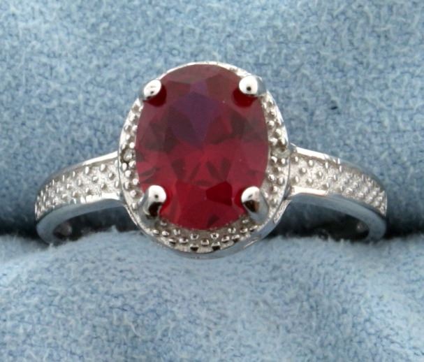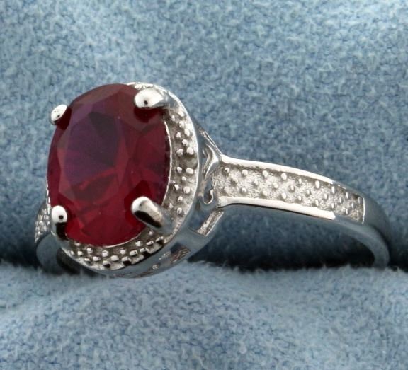 Classic genuine lab Ruby gemstone ring with 0.01ctw genuine Diamonds accenting the center stone set in Platinum over Sterling Silver, size 8. 2.4g