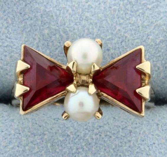 In 10K yellow gold, there is two 6.5mm trillion cut rubies and two 4.5mm pearls. Size 7 1/2 4.3g
