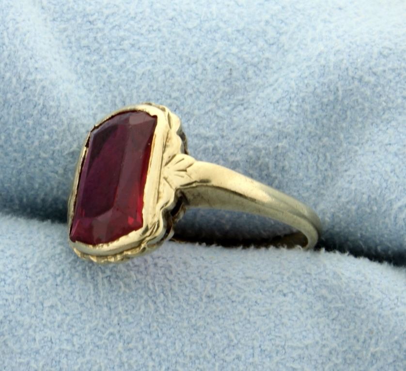 In 10K yellow gold the 12x8mm lab ruby has excellent color and clarity. Size 5 1/2 3.5g
