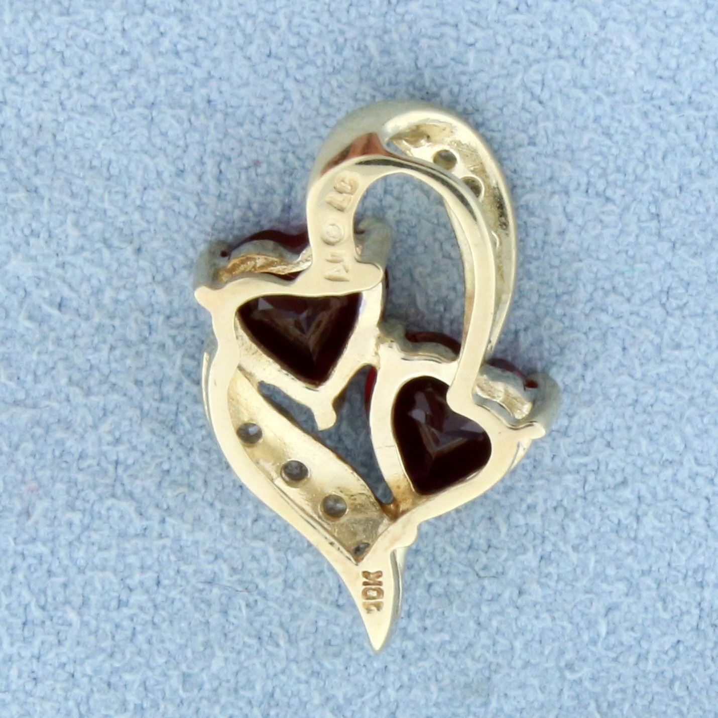In 10K Yellow Gold. Contains two 6mmHeart Shaped Lab Rubies with intense Ruby color and excellent clarity. Also contains eight .01ct high quality Diamonds,I clarity/H color. 3/4 inch long. 1.7g.