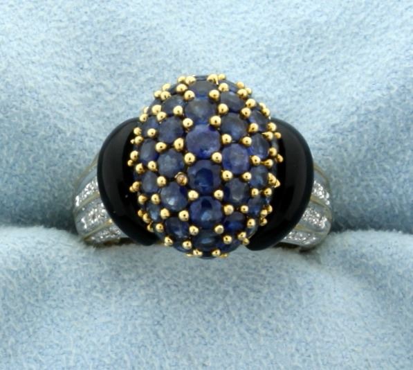 In 10K yellow gold there are 2cts total weight of round lab sapphires with deep blue color. Also contains sixteen .01ct diamonds. Size 7 7.7g