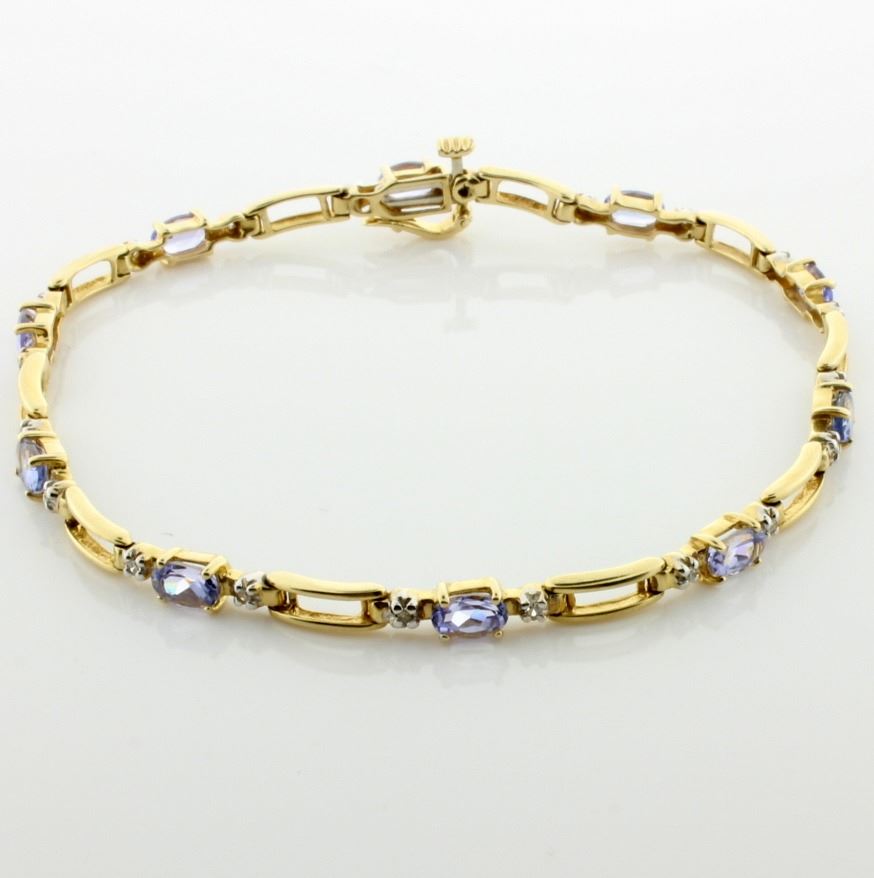 In 10K yellow gold, it is 7 1/2 inches long with a safety clasp. It contains ten 5x3mm oval lab tanzanite gemstones, for a total weight of 2.5cts, with beautiful color and clarity. There are also twenty 1/2pt diamonds. 6.2g