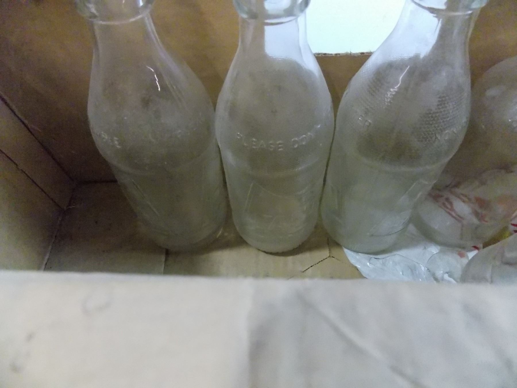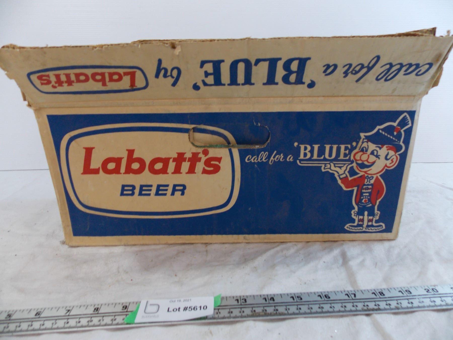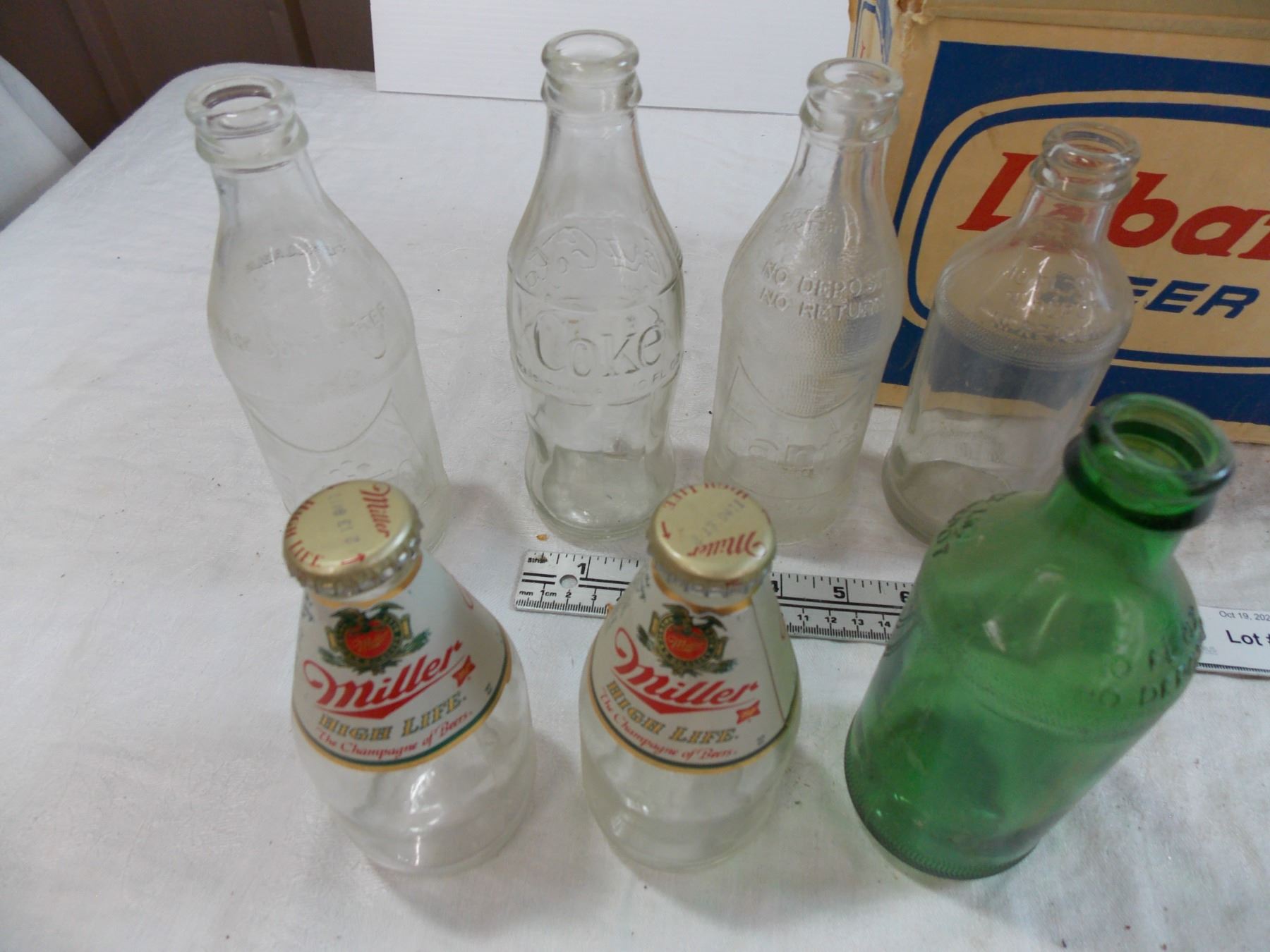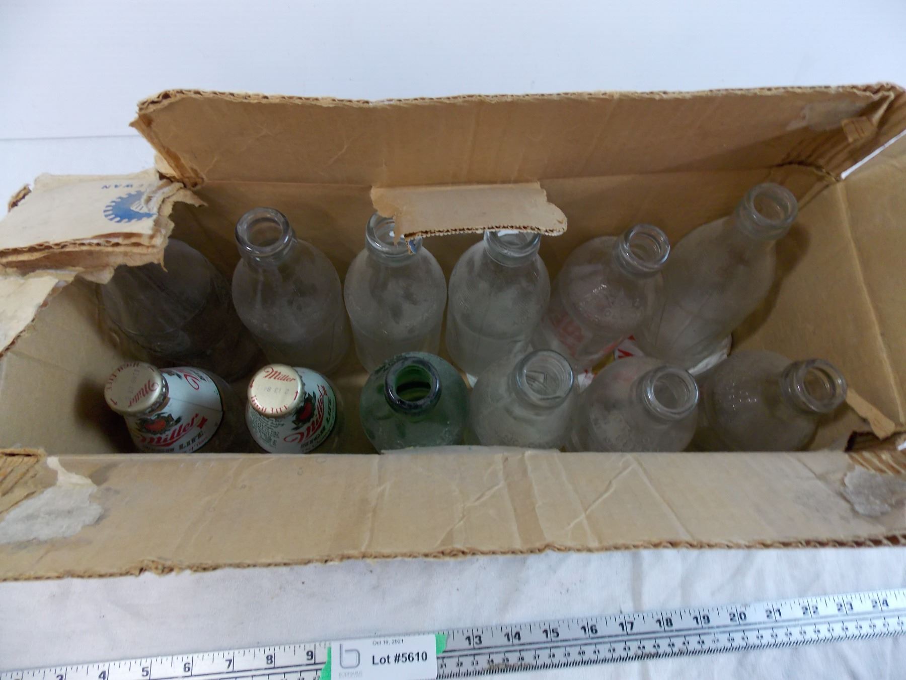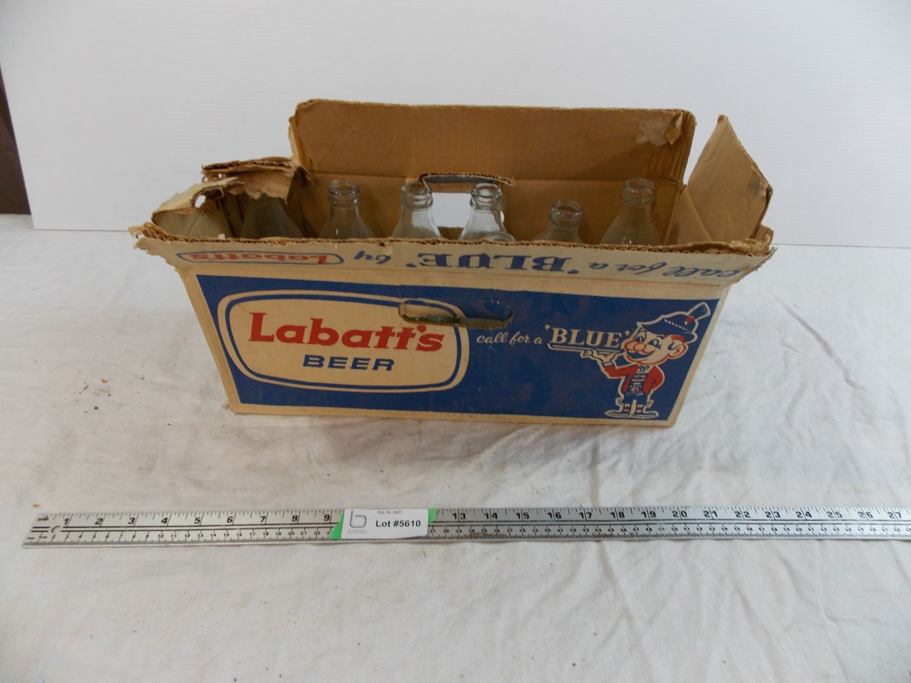 Labatt's Blue cardboard beer box - with various clear glass bottles (FANTA, Millar stubbies, misc)