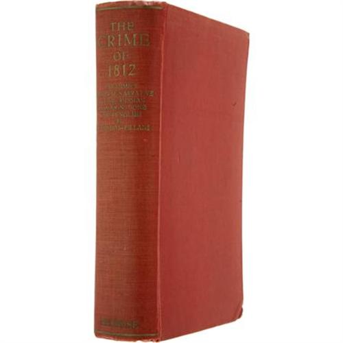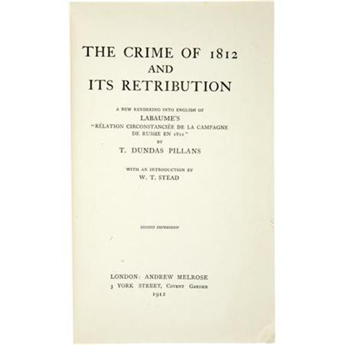 <B>[Eugene Labaume], T. Dundas Pillans, translator. </B></I><B><I>The Crime of 1812 and Its Retribution</B></I></B></I><B>.</B></I> A New Rendering into English of Labaume's "Relation Circonsanciee de la Campagne de Russie en 1812" By T. Dundas Pillans. With an Introduction by W. T. Stead. Second Impression. London: Andrew Melrose, 1912. <BR><BR>First edition, second impression. xx, 295 pages. [2, publisher's ads]. <BR><BR>Publisher's red covers with spine lettered in gilt. Slightly sunned spine, bumped corners. Altogether a very good copy.<BR><BR>T. Dundas Pillans expertly translates the revealing work by Eugene Labaume, a lieutenant-colonel in the French army, which recounts in detail the day to day experiences he encountered while part of Napoleon's 1812 campaign to Moscow.<BR><BR><b>Shipping:</b> Books & Catalogs (<a target="_blank" href="http://www.heritageauctions.com/common/shipping.php">view shipping information</a>)