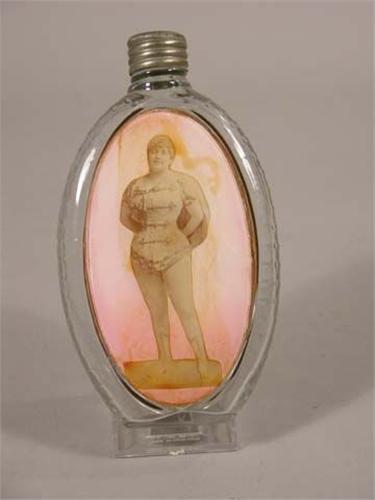 Label under glass flask with provocative women. 6" tall, diamond design on back side. Some staining to image background but no cracks.
