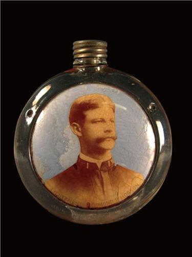 Label Under Glass Military Flask, canteen style. U.S. Military, Lt. Richmond P. Hobson. 2 small cracks at 5:00 otherwise excellent condition. 4 1/2 inch dia.
