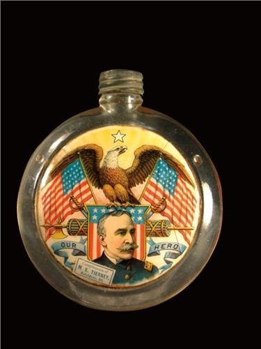 Label Under Glass Military Flask, canteen style. U.S. embossed on back, compliments of M.S. Tierney, Belvidere, IL. Patriotic motif with Dewey and eagle motif. Crack from 2:00 to 4:00 otherwise excellent condition. 4 1/2 inch dia.