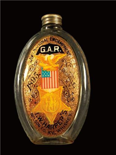 Label Under Glass Pocket Flask. I.W. Harpers Whiskey 29th National Encampment for G.A.R. 1895 Louisville, KY, Nelso Co. No chips or cracks. 3 1/2 X 6 inches.