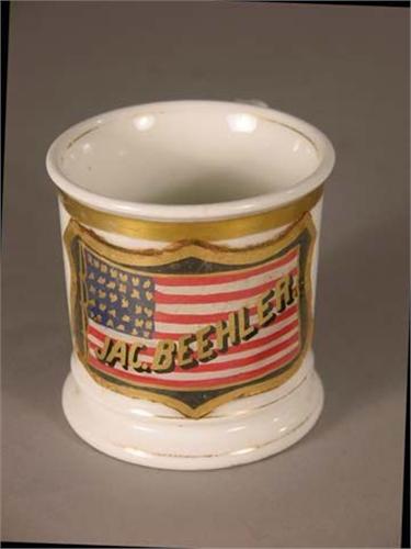 Label under glass shaving mug for Jac. Beehler - American flag motif, no chips or cracks.