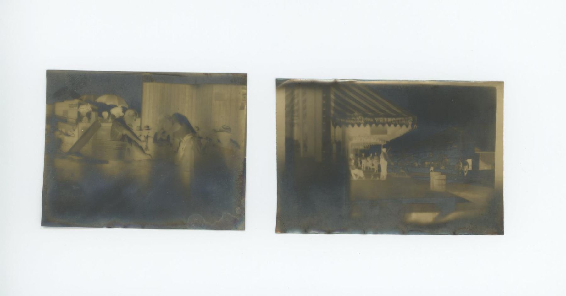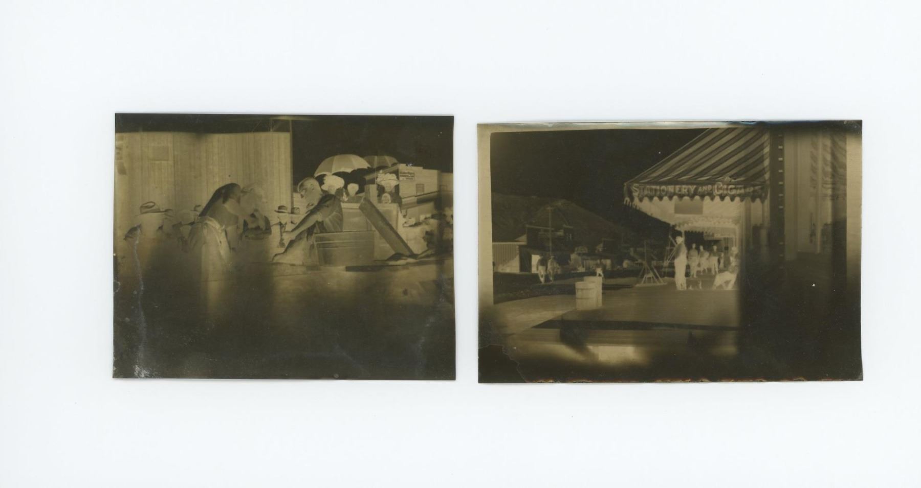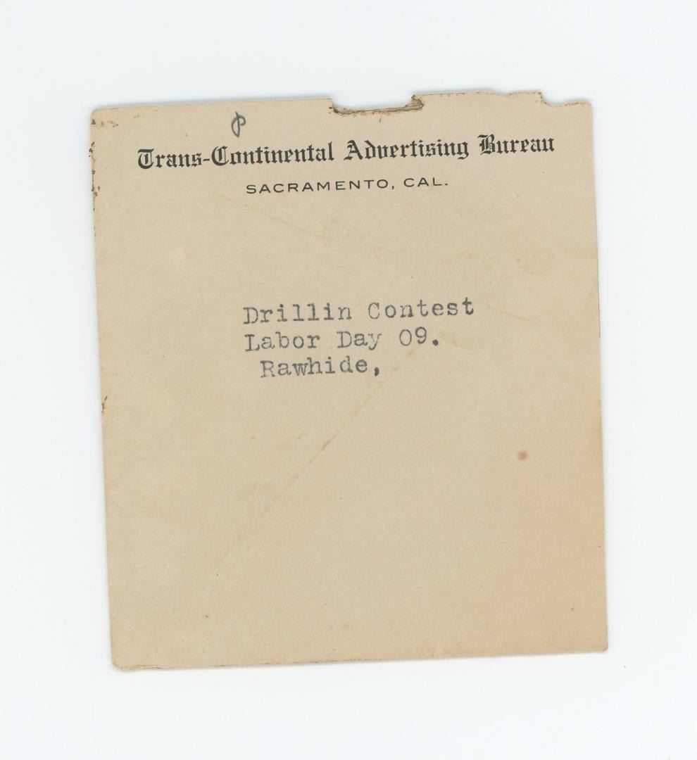 Boomtown Rawhide Nevada, 3 3/8" by 2 3/8". In December 1906, prospector Jim Swanson made a discovery of a rich gold and silver deposit in the hills near what became Rawhide. He was soon joined by Charles ("Charley") B. Holman and Charles ("Scotty") A. McLeod, who also found sizeable deposits nearby on Hooligan Hill. McLeod had recently been ordered to cease prospecting around the nearby camp of Buckskin, and bitter about this, he suggested the name of Rawhide for the new camp, as a play on the name of the Buckskin camp he held with contempt. Word spread, and both Holman and McLeod sold their claims to investors and moved on to Stingaree Gulch later in 1907, where they found yet another large deposit. The two men sold these claims for even more money, and then left the area to prospect elsewhere. The frenzy that these claims created soon had Rawhide booming. Investors began selling stocks at a frenetic pace, and the town soon had a population of about 5,000, with: three banks, four churches, a school, twelve hotels, twenty-eight restaurants, a theater, and thirty-seven saloons. While the original mines and claims did produce a decent profit in gold and silver, the fever created an amount of activity far in excess of what the mines could support. Stock swindlers like George Graham Rice, a flashy con-artist from Goldfield, plied their trade, creating a sense that Rawhide would be the next Virginia City (or the like of any number of other Nevada boom towns), with untold riches to be had for the savvy folks who would just invest in his companies. Others, like businessman George "Tex" Rickard came to Rawhide to establish legitimate businesses, and make money off the boom while it lasted. Rawhide's hey-day was short-lived; the glaring, gross over-promotion which manipulators performed to inflate the worth of Rawhide doomed its chance for success from the start. In the short span of two years the town went from its peak population of 7,000 people (March to June, 1908), to fewer than 500 people by the latter part of 1910. Helping push the decline of the town even further along was a disastrous fire which swept through Rawhide in September 1908, along with a flood in September 1909, from which many people did not recover or rebuild. While the original mines worked out the last of the gold and silver from the veins first discovered by Swanson, Holman, and McLeod, people began to leave the area, moving to the next "big thing". While there remained a few people eking out a life working in the mines, or processing the ore, or just working their own claims and prospecting, for all intents and purposes the town became a hollow shell of what it once was. The population was 32 in 1940.