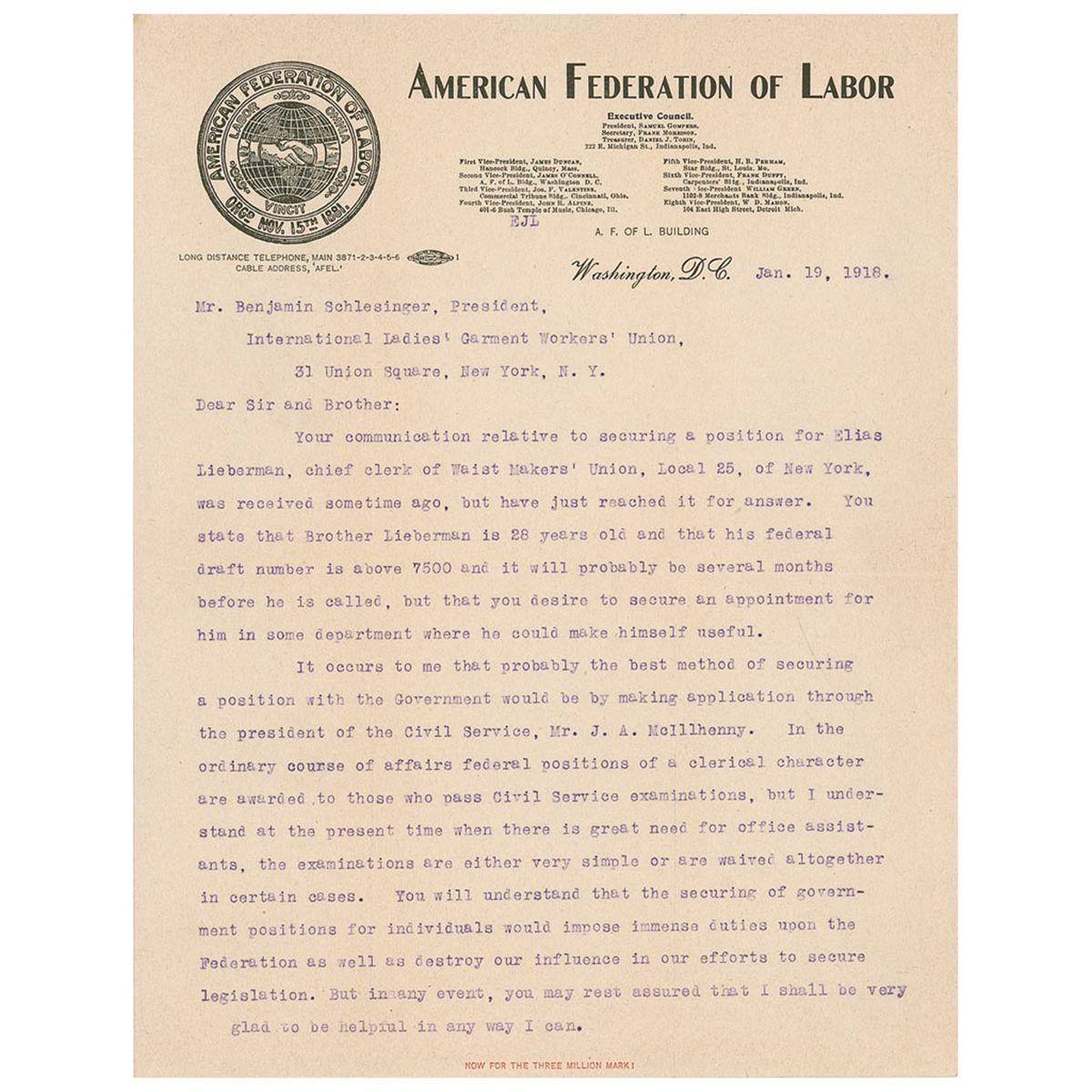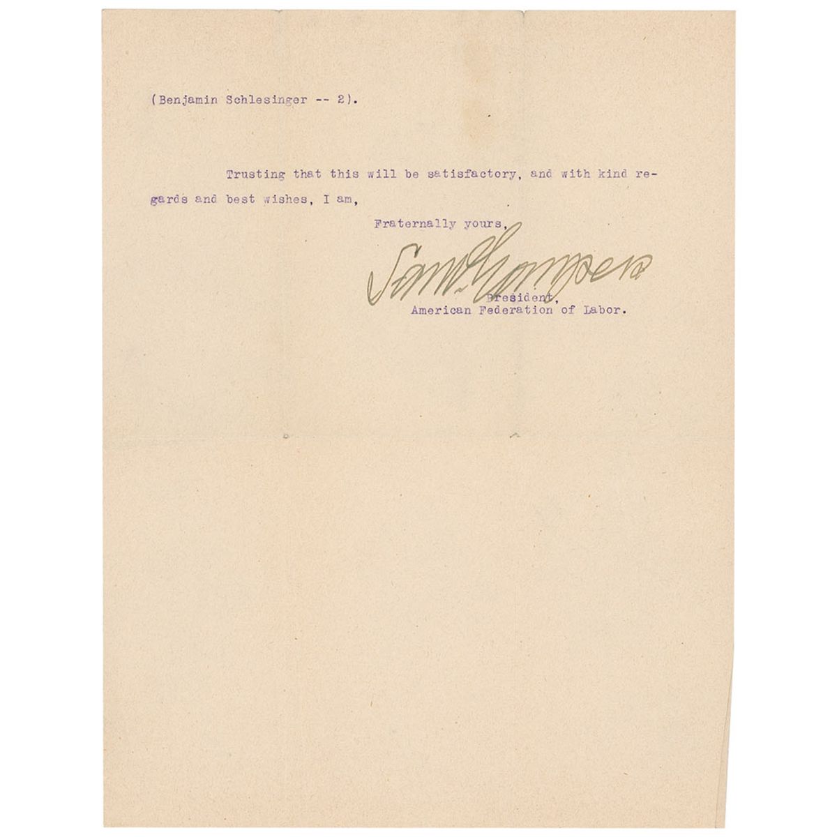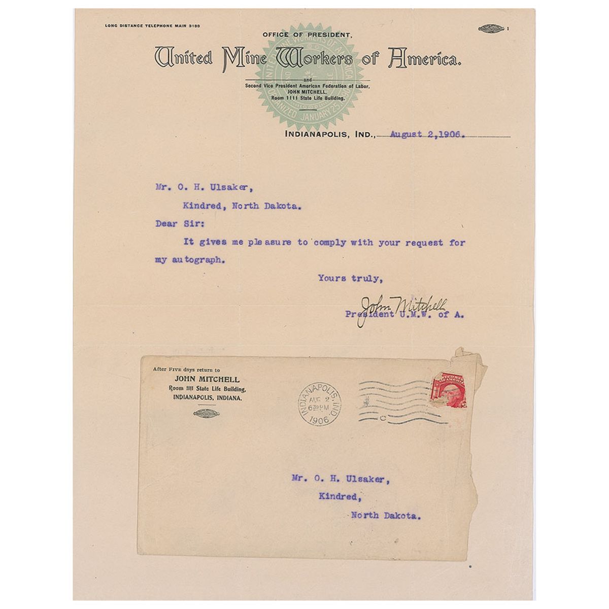 Samuel Gompers was the Founder of the American Federation of Labor who served as that organization's president from 1886 to 1894 and from 1895 until his death in 1924; John Mitchell was the president of the United Mine Workers of America from 1898–1908. Two TLSs: TLS, signed “Samuel Gompers,” two pages, 8.5 x 11, American Federation of Labor letterhead, dated January 19, 1918. In a letter to Benjamin Schlesinger, President of the International Ladies Garment Workers’ Union, Gompers responds to a request for employment, in part: “Your communication relative to securing a position for Elias Lieberman, chief clerk of Waist Makers’ Union, Local 25, of New York, was received…It occurs to me that probably the best method of securing a position with the Government would be by making application through the president of the Civil Service, Mr. J. A. McIlhenny…You will understand that the securing of government positions for individuals would impose immense duties upon the Federation as well as destroy our influence in our efforts to secure legislation. But inaany [sic] event, you may rest assured that I shall be very glad to be helpful in any way I can….”; and one TLS, signed “John Mitchell,” one page, 8.5 x 11, United Mine Workers of America letterhead, dated August 2, 1906. Letter from Mitchell, thanking an admirer for an autograph request, with the original mailing envelope affixed to the lower portion of the letter. Intersecting folds to both, two mildly affecting Mitchell’s signature and one affecting Gompers’, light toning to the Gompers letter, and light wrinkling, otherwise fine condition.
