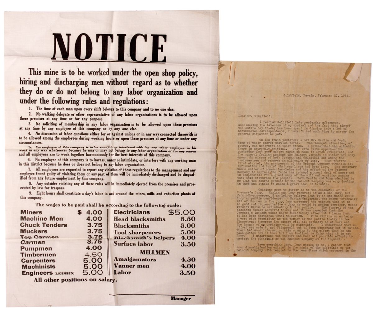 Lot of 2, including an unsigned letter to George Wingfield, dated 27 February 1911, in which the writer tells of his concerns over a possible uprising by the miners in Goldfield. He tells Wingfield the while on his way to Esmeralda County by train, he met and had discussions with a Mr. Hanlin and a Capt. Long "of their secret service force." The letter is 4 pp long, intact, although yellowed and has some tears and fold creases. It is an excellent and insightful look at labor in the mines of the period. Also included is an 11" x 17" anti-union rules for miners. Some of the listed requirements and rules are the pay rates for different jobs, ranging from $3.50/day for surface and mill labor, to $5.00/day for electricians, engineers, carpenters, and machinists. The rules also state that "Eight hours shall constitute a day`s labor in and around the mines, mills and reduction plants of the company." Very good to new condition, with some fold creasing. -59048