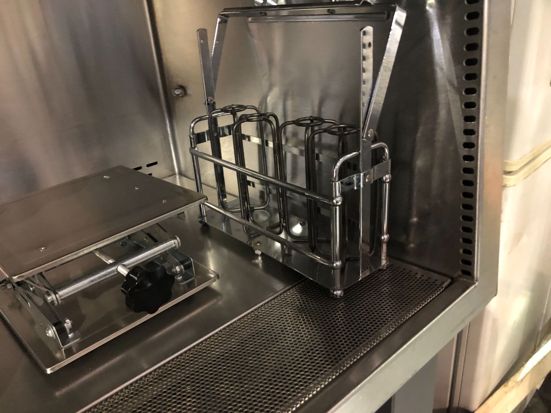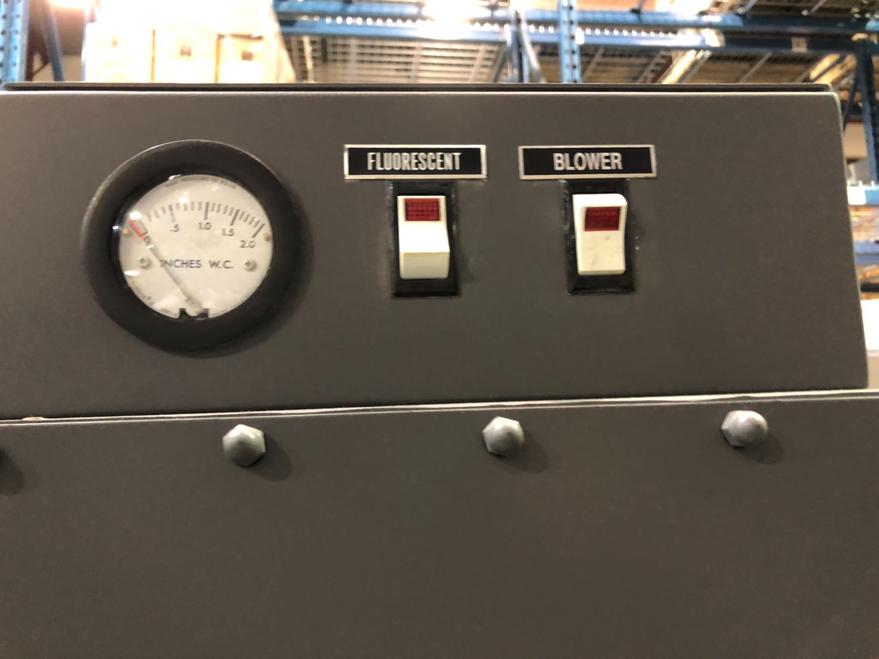 Laboratory ventilation & containment testing station (approx 50" W x 30" L x 79" H) w/ assorted lab accessories - microscope / steel lab jack scissor stand platform etc