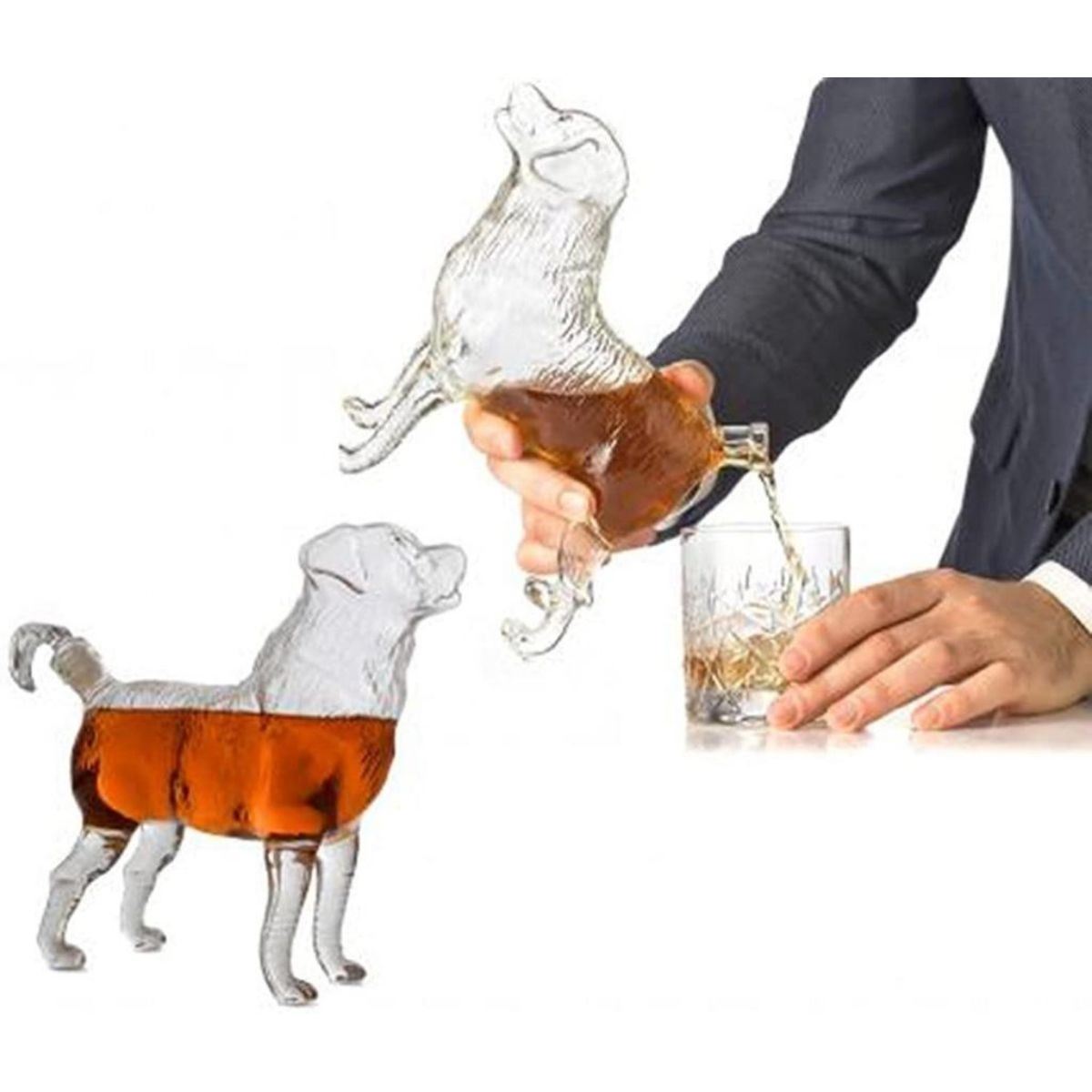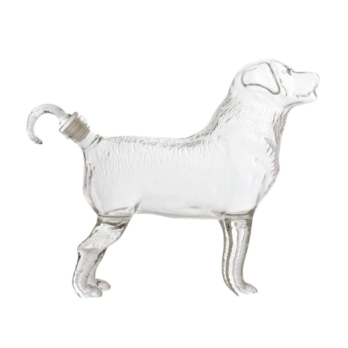 Labrador Retriever Glass Dog Decanter for liquor. Holds up to 17oz of beverage, with encased rubber stopper. 8 1/2" L X 8" H X 2 3/4" W.