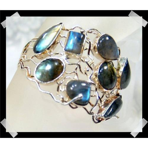 Sophisticated, superb craftsmanship with the finest quality silver adorned with extravagant natural labradorite gemstones! This cuff sports a unique design enhanced with bold graceful lines. The height is 43mm with a gram weight of 48. Inside measurement of 7" with an opening of .25".