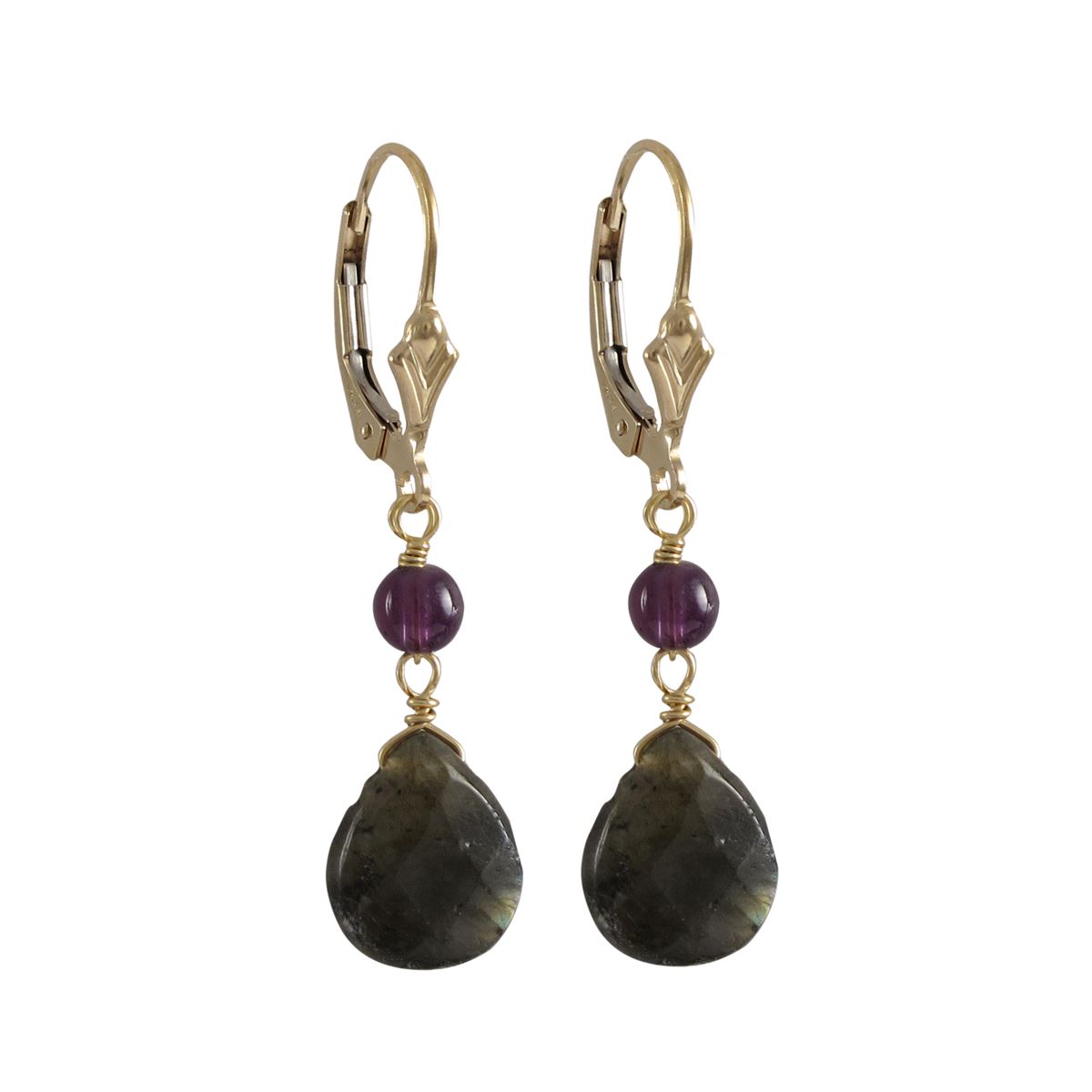 Labradorite(Grey) 9.5X11mm Teardrop And Amy 4Mm Ball Semi Precious Stones On Gold Filled Lever Back Earrings, 1.54"