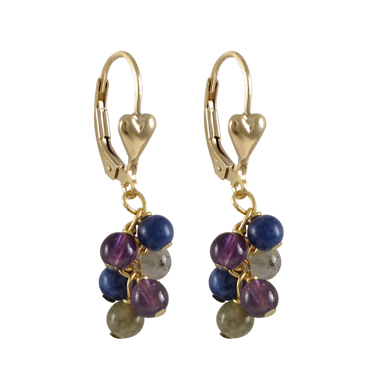 Labradorite(Grey) Combination 4Mm Semi Precious Balls In Bunch Dangling On Gold Filled Heart Lever Back Earrings, 1.26"