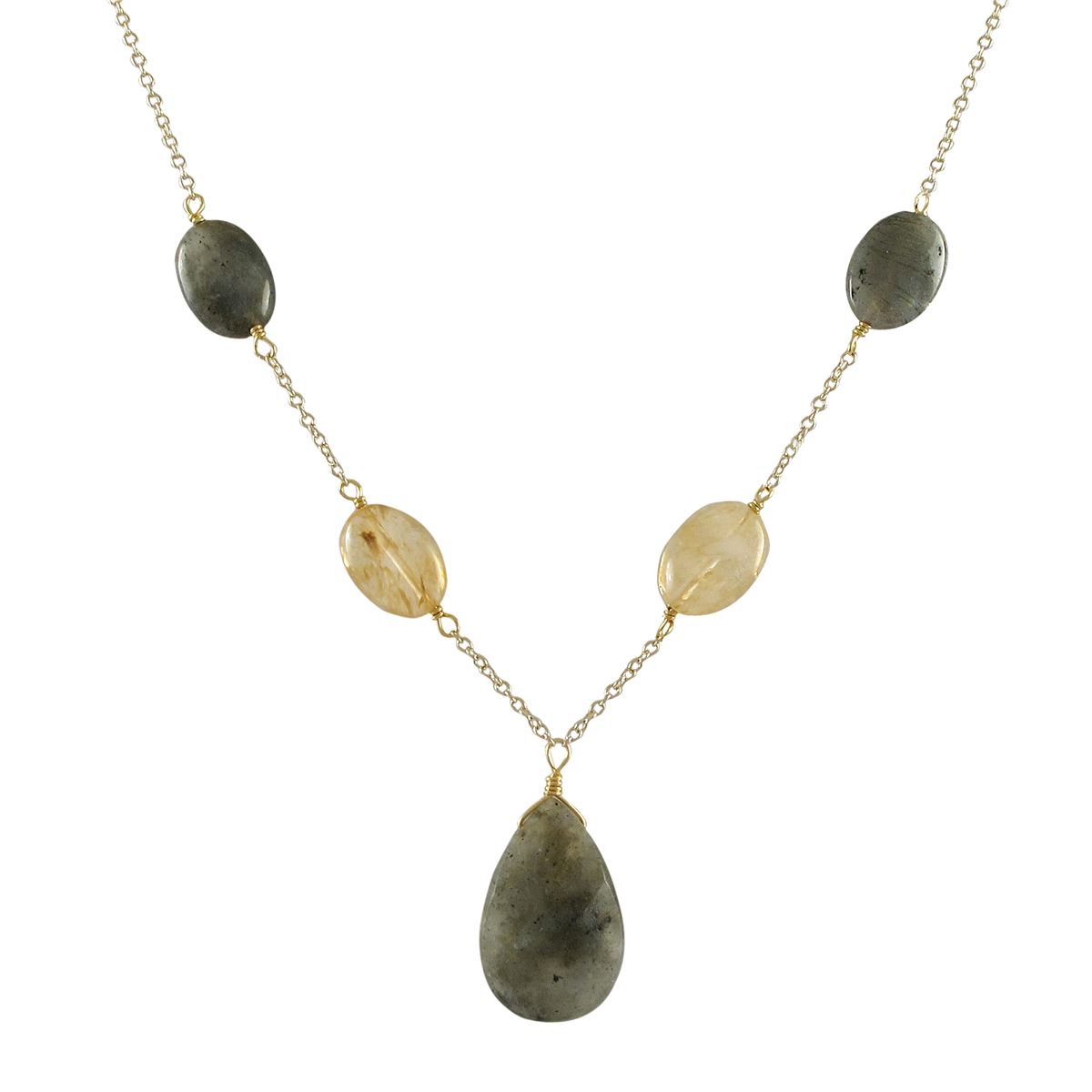 Labradorite(Grey) Teardrop Semi Precious Stone Y Necklace, Gold Plated Brass Chain, 18" 2"