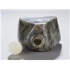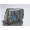 A labradorite snuff bottle. Late 19th/early 20th century. Well-hollowed with a sloped neck, agate top with ivory spoon. 1 3/4".