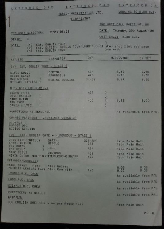 Labyrinth (1986) - Call Sheet Aug. 29th 1985.