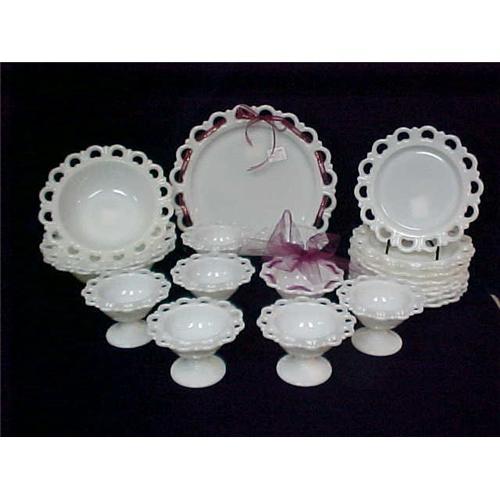 Lace Edge Milk Glass by Anchor Hocking - "Old Colony" from the 1950's. Twenty (20) piece set in very good condition: large 13" Cake Plate / 3 Bowls, approx 9.5" / 8 Fruit Sherbets and 8 Salad Plates